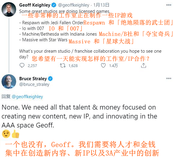 关于顽皮狗正在进行的新项目,目前可以确认的消息还很少,是一款新IP还是系列新作也很难说。有意思的是,日前TGA主持人 Geoff Keighley 在推特上发起了一个问题,询问大家希望哪一家工作室与哪一款IP合作最合心意,曾在顽皮狗任职的 Bruce Straley 给出了非常有意思的答案。