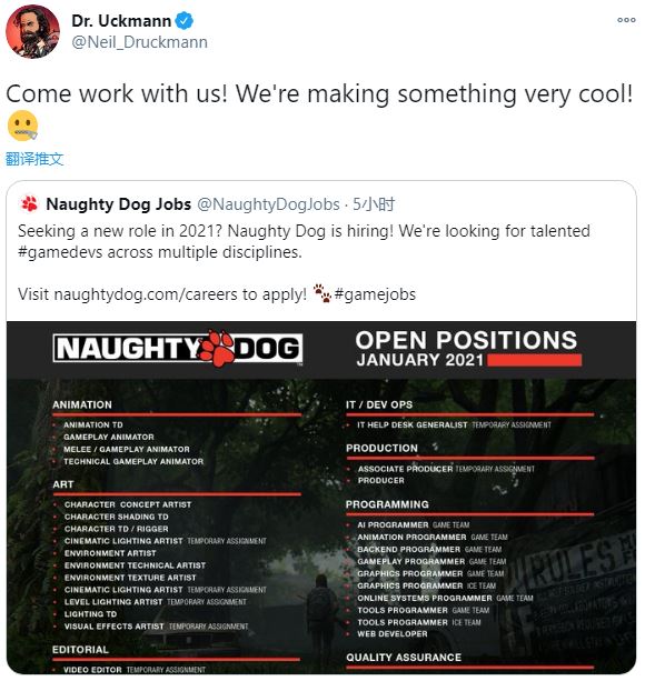 《最后生还者2》的总监,现已升任顽皮狗工作室联席总裁的 NeilDruckmann 也通过推特转发了这一消息,他表示“我们正在做一些非常酷的事”: