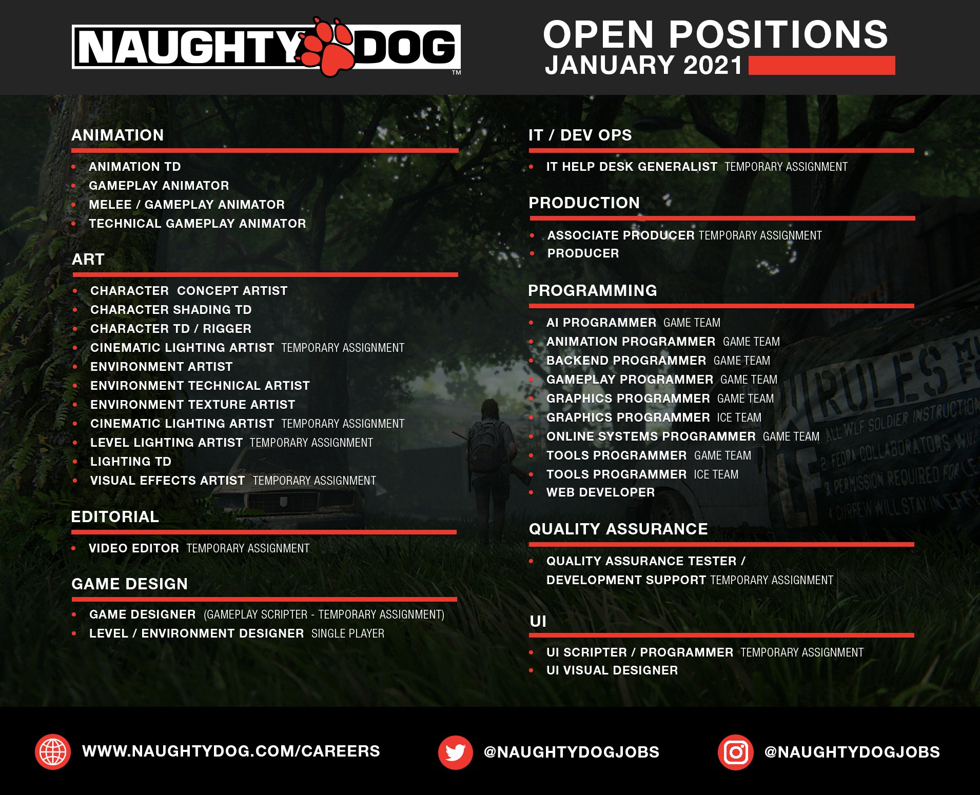 顽皮狗工作室官方公开了他们2021年1月的人员招募公告,职位涉及到动画、美术、游戏设计、编程、产品等各个方面,他们正在开发多个项目的猜测似乎进一步得到了验证。