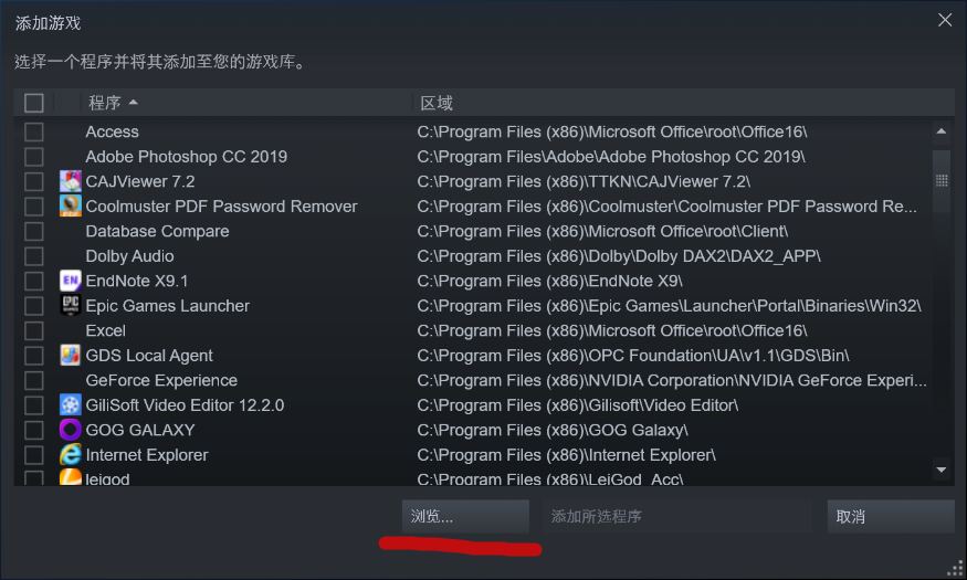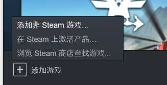 回到steam,点击主界面右下角的添加游戏,添加非steam游戏,如下两图所示:
