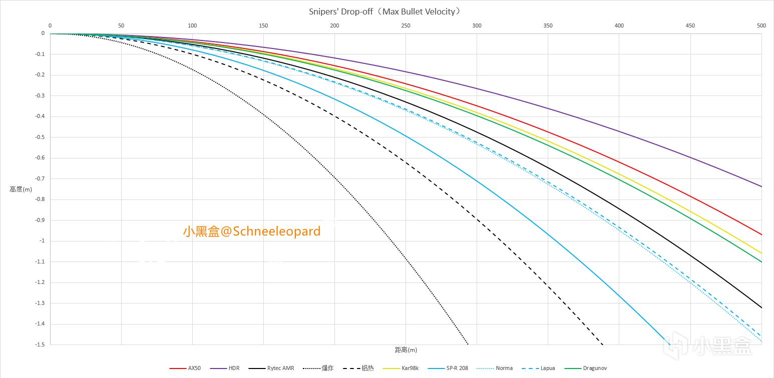 能看出极限弹速HDR>AX50>Kar98k>Dragunov>Rytec AMR 默认子弹>SP-R 208 Lapua>SP-R 208 Norma>SP-R 208 默认子弹>Rytec AMR 铝热弹>Rytec AMR 爆炸弹。弹速越快,所需的抬枪越少提前量越少。这也只是水平射击的情况,带点俯仰角情况就变了,向下俯角度射击所需要的抬枪变少一些,相反向上仰角射击所需要的抬枪增加一些。实际还要考虑目标的移动,还是多玩,形成经验和手感。一般打远用的HDR、AX50、Kar98k抬枪也不需要太多。