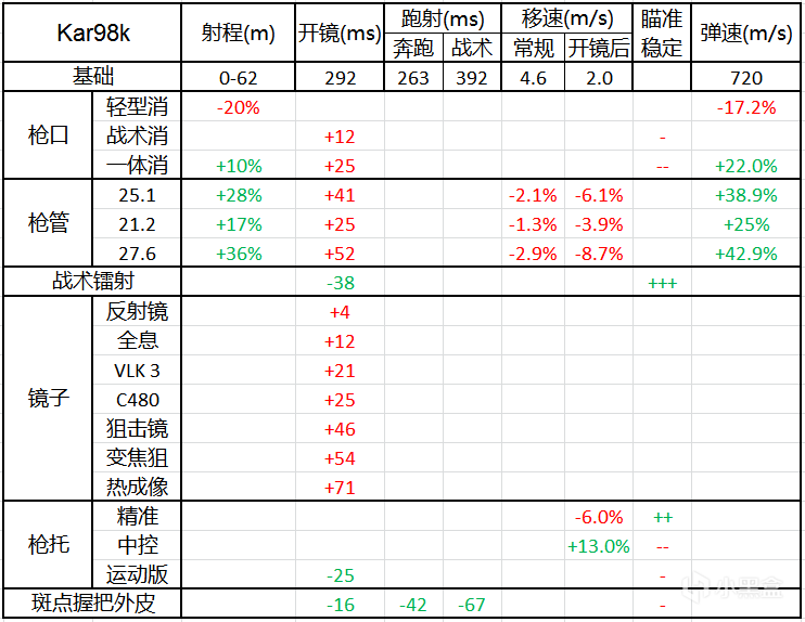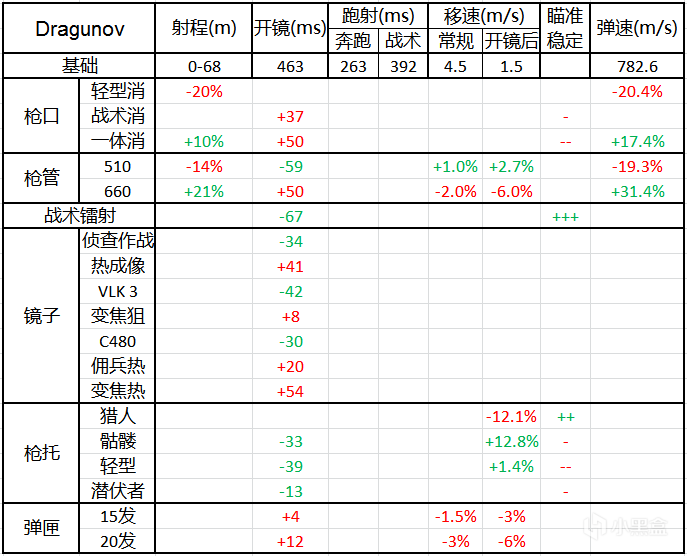 本体多人,机动性需要些,所以枪托用了骷髅枪托,上面数据表可以看下,骷髅应该说是完爆轻型的,这两款枪托游戏内的描述都不是太完整,都没写开镜后的移速。镜子可以换成集中注意力(减轻中弹后枪上跳) / 镇定自若(延长屏息时间,屏息等于稳定性直接MAX+++)