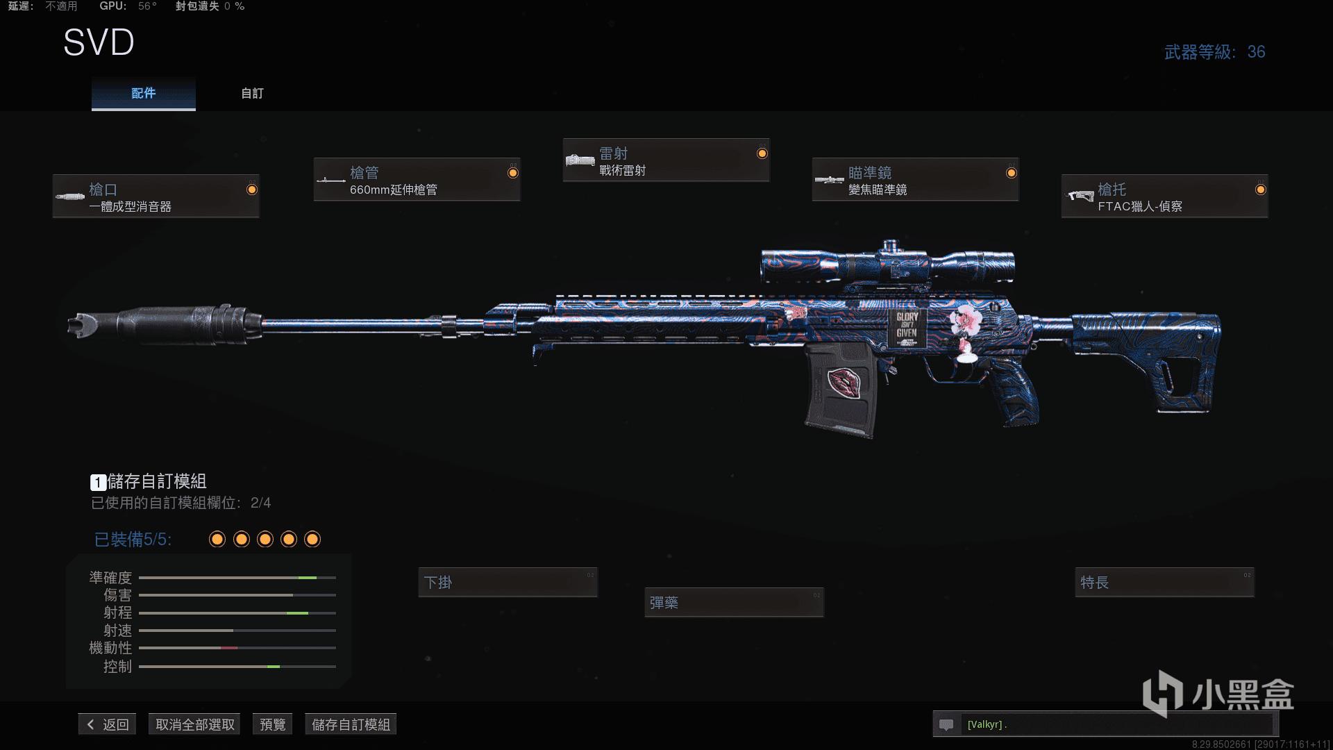 德拉贡诺夫狙击步枪,SVD。半自动,射速可达190 RPM,裸配射击后枪口无法完全回正(幅度可以接受,加强过一次,之前还是蛮难用的)。