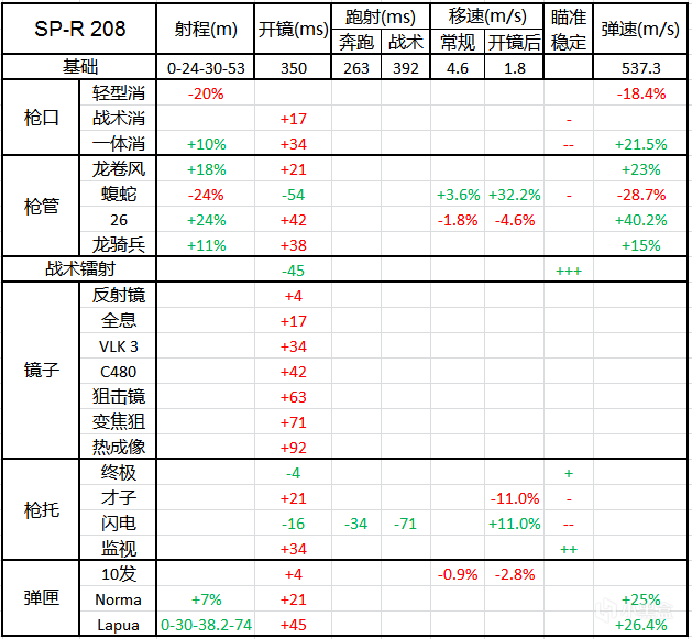 另外两个配件在SP-R 208削弱前,肯定是蝮蛇枪管+Lapua。蝮蛇枪管,唯一的短枪管,在平衡更新后有了减稳定性的负面,而Lapua弹匣又额外加了一些开镜时间。