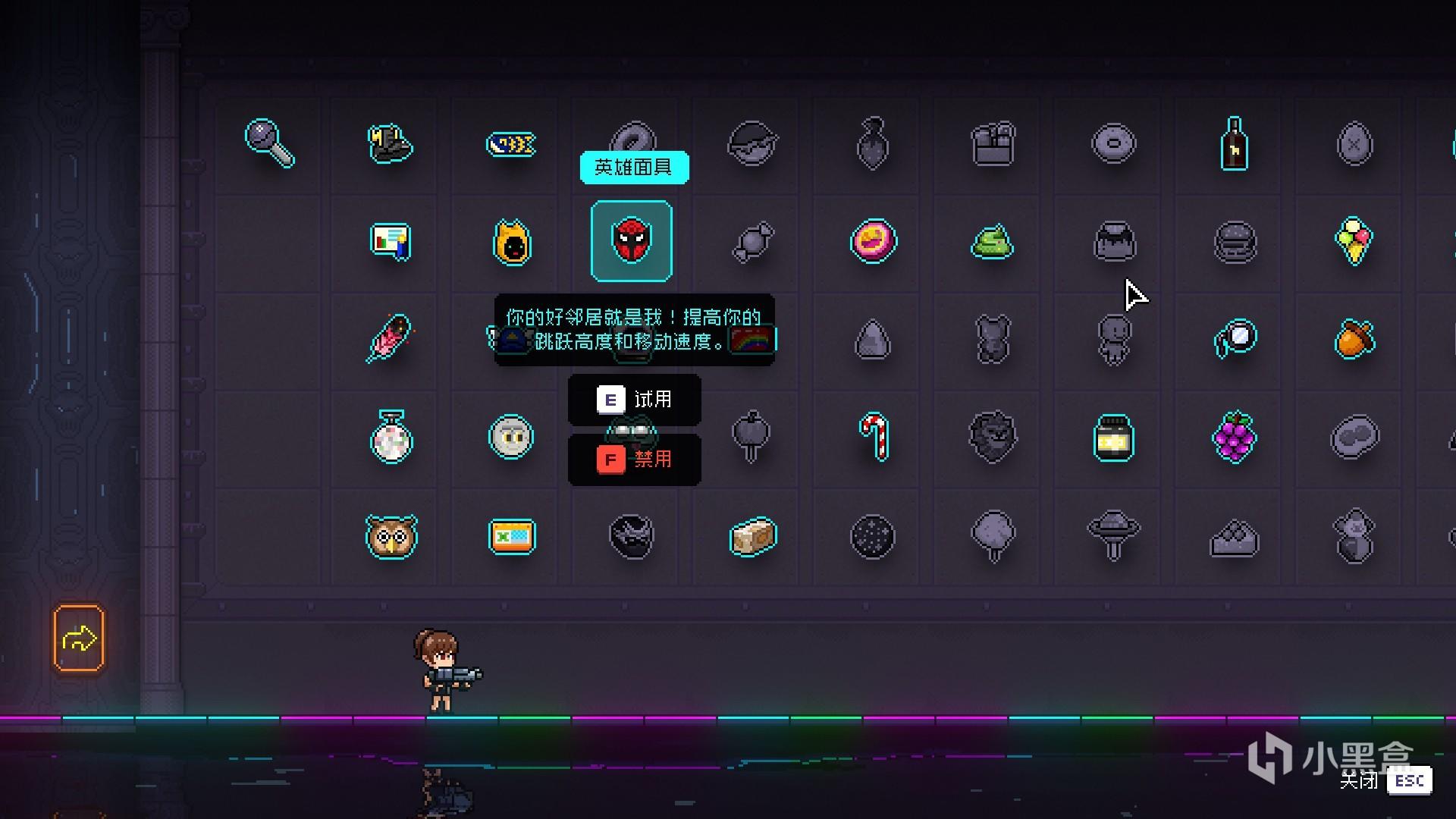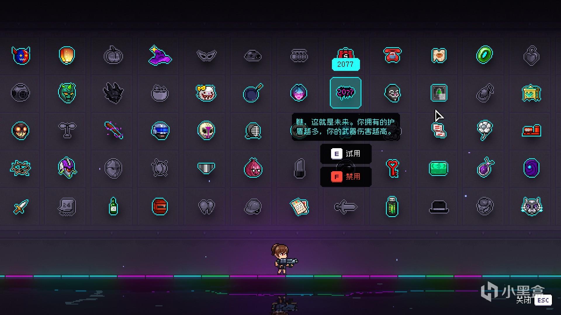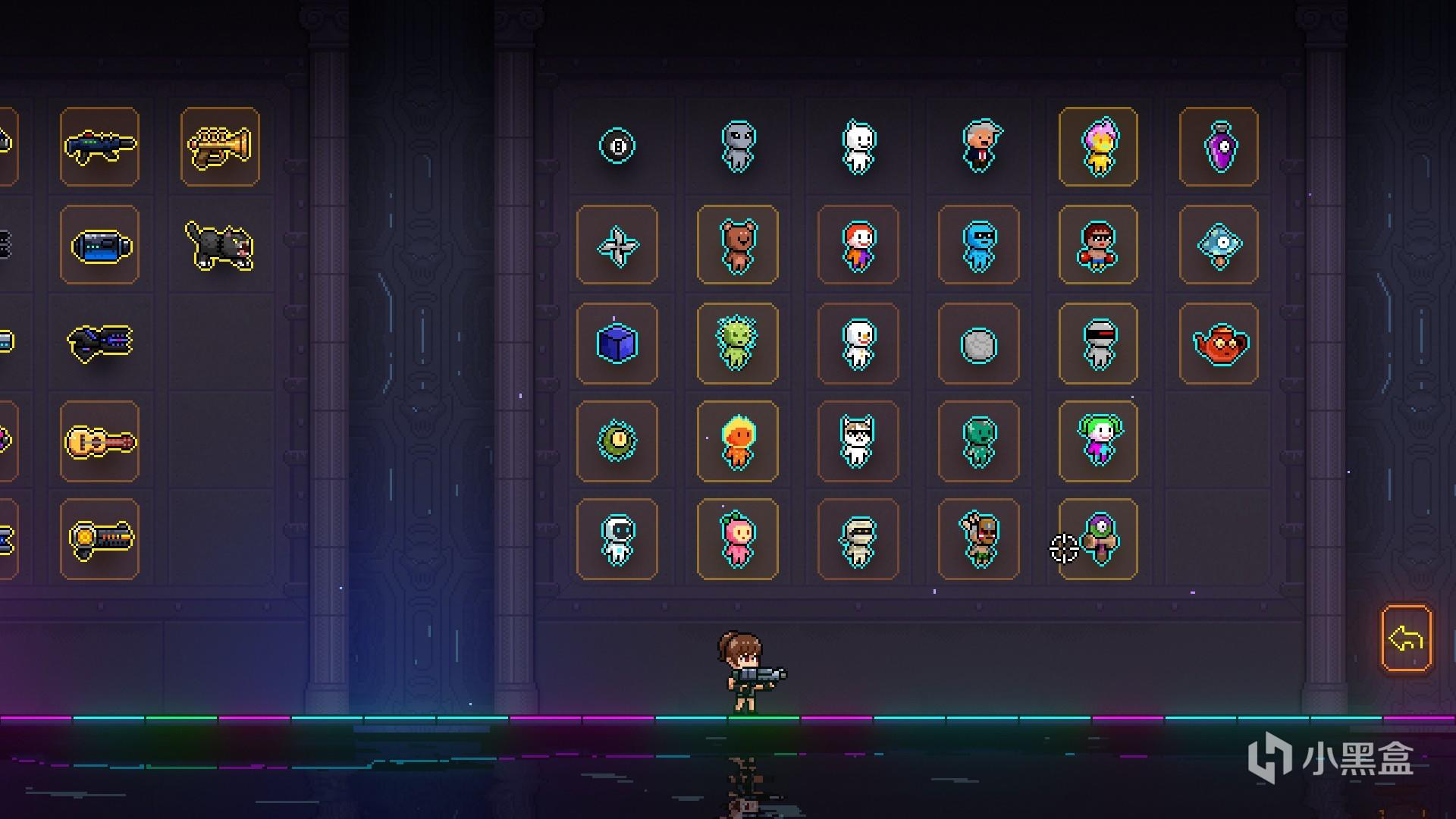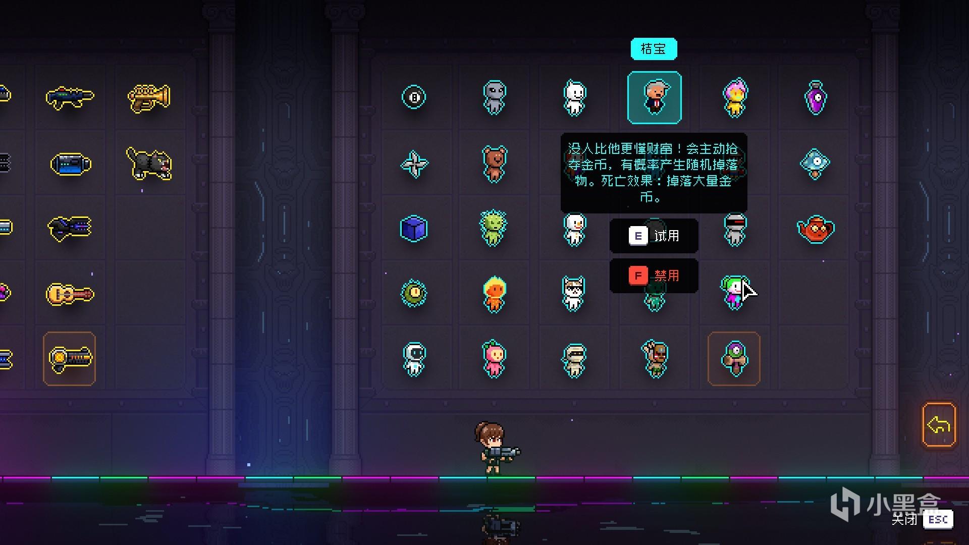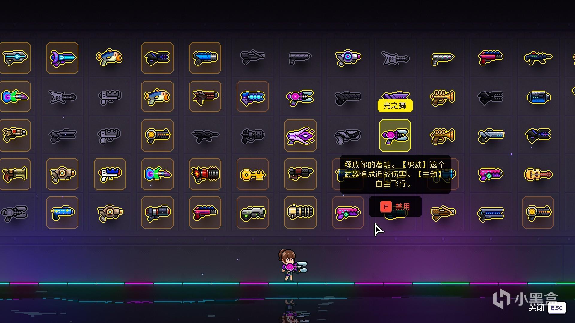 武器数量不算多,有些武器重复的是因为它们的主动技能有不同。《霓虹深渊》的所有获得的武器都展示在房间的武器墙上面,在这一点跟《元气骑士》很是相似,不过对我来说我更喜欢《死亡细胞》放在瓶子里面的设计。不过《霓虹深渊》有一点我觉得挺好,就是在武器房是可以试用武器的,而且你如果觉得这把武器不行,可以禁用它,很舒服。