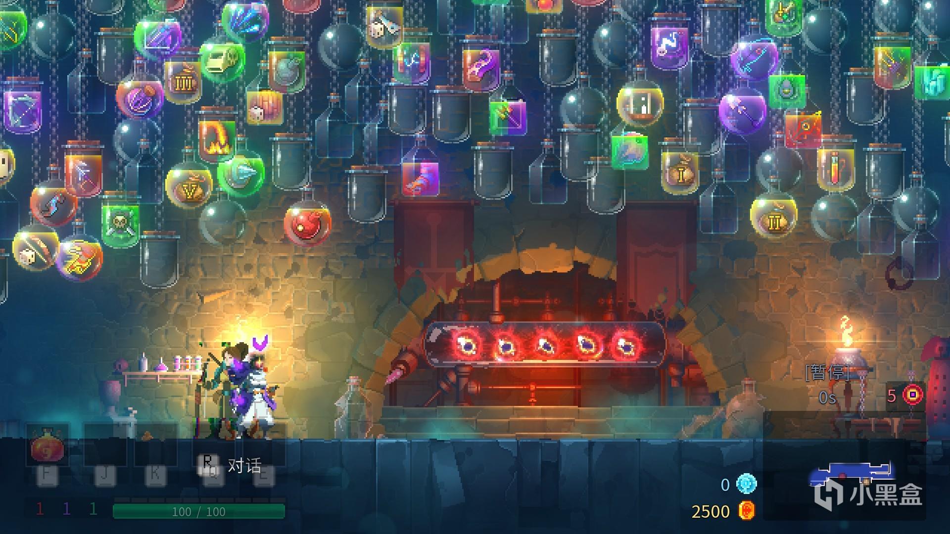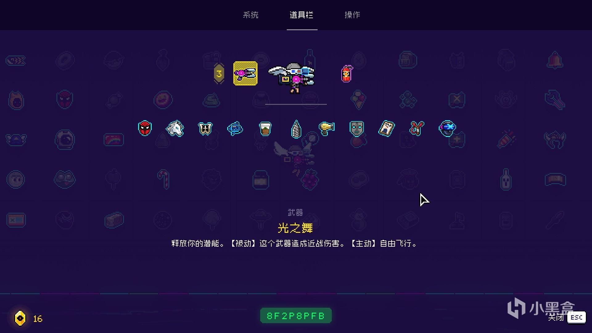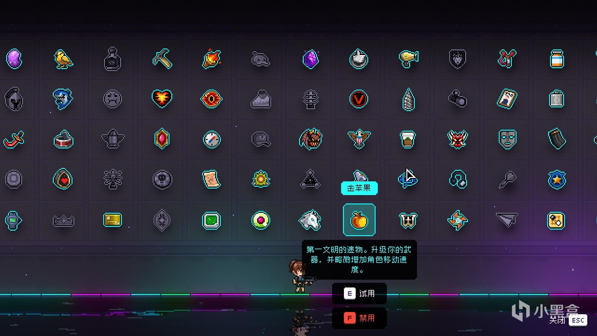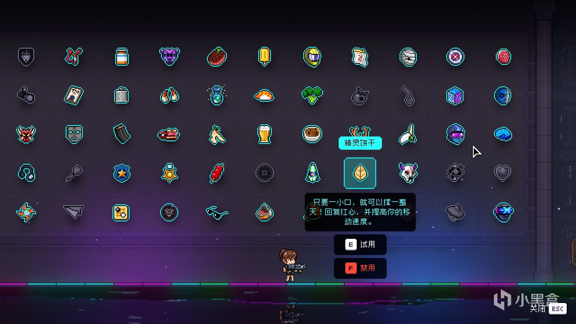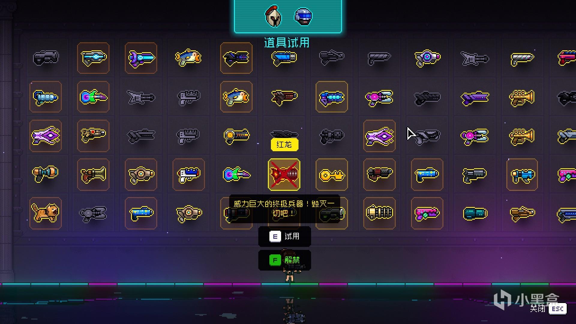 武器数量不算多,有些武器重复的是因为它们的主动技能有不同。《霓虹深渊》的所有获得的武器都展示在房间的武器墙上面,在这一点跟《元气骑士》很是相似,不过对我来说我更喜欢《死亡细胞》放在瓶子里面的设计。不过《霓虹深渊》有一点我觉得挺好,就是在武器房是可以试用武器的,而且你如果觉得这把武器不行,可以禁用它,很舒服。