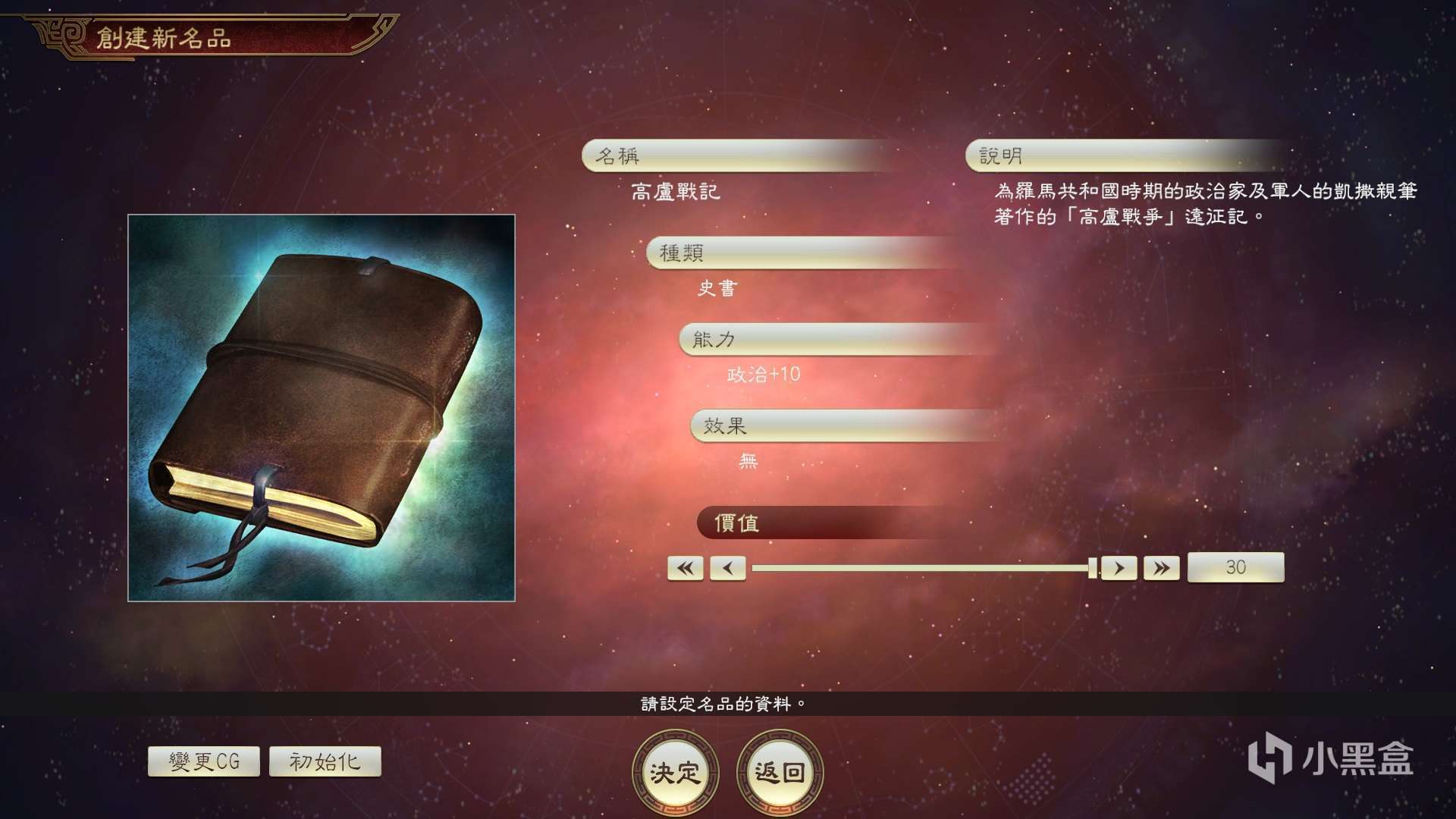 「新名品编辑功能」是以游戏中登场的名品为基础,自由更换名称、效果并制成全 新名品的功能。玩家可以随心所欲地制作属于自己的名品,包括在三国时代还未出 现的名品及架空的名品等。