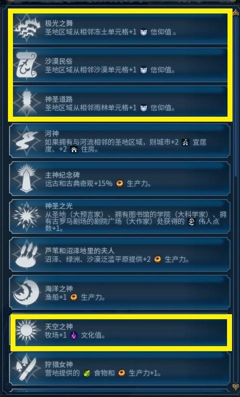 另一个特例则是极光之舞/沙漠民俗/神圣道路——这三个万神殿的特性都是通过周边的相同地理环境来为圣地提供额外加成,我下面会着重讲一下此类万神与宗教配合的方法。