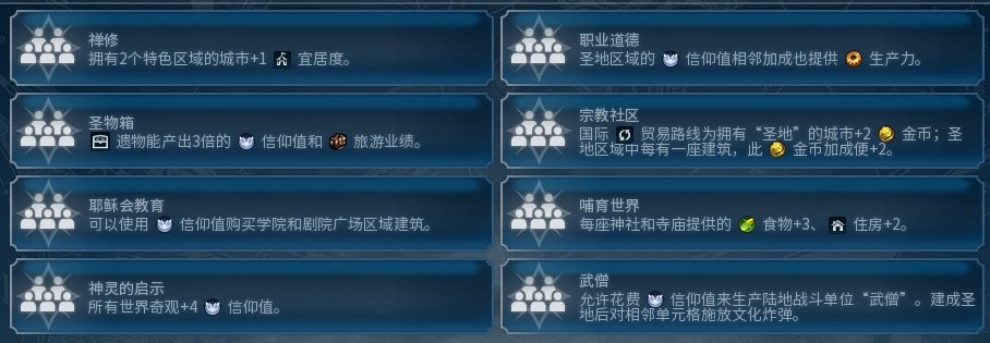 在市政树最下面一栏的神学中可以解锁[经文]政策,为圣地提供100%的信仰加成。