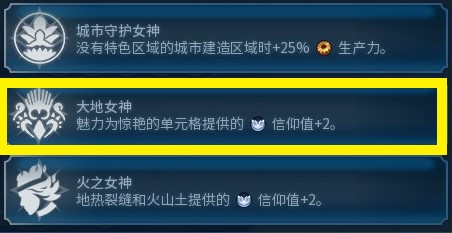 比较特殊的是大地女神,建议进入游戏后先打开魅力值面板先看看周围的地块,如果可以坐分城的魅力较高的话,那么上限极高的大地女神能为玩家提供大量信仰。注意:自然奇观的周边地格魅力普遍较高,如果能吃到四五个格子的受益的话,那么只需要50t,就可以免费白嫖到400点信仰(4×2×50)!