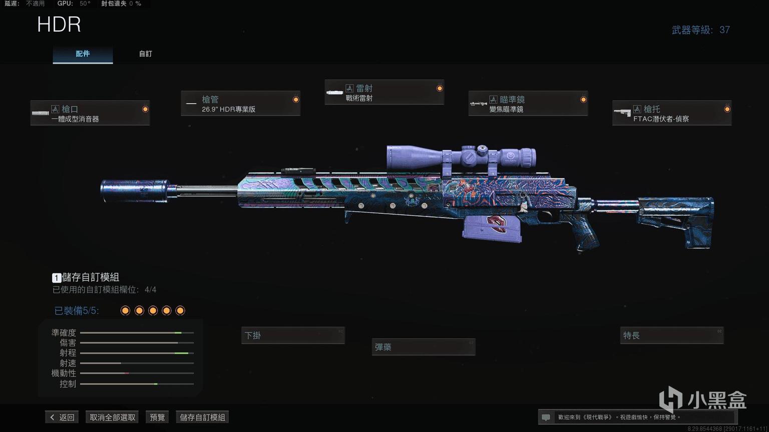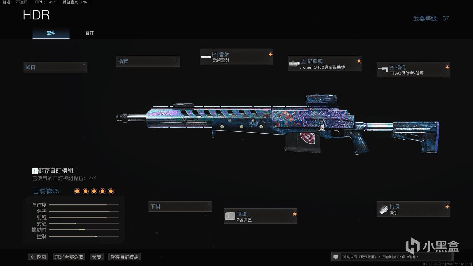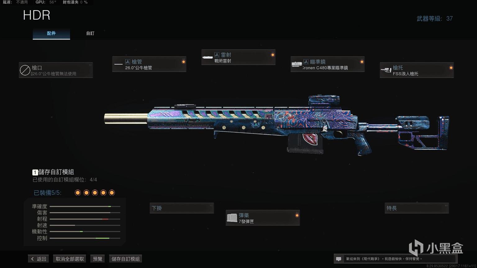 第一套是很常规的HDR配置,打远26.9专家枪管必备,满改射程,海底摄影变焦镜改善视野,枪托镭射满改稳定性。开镜时间667ms,弹速1422.3m/s,开镜移速仅0.77m/s。