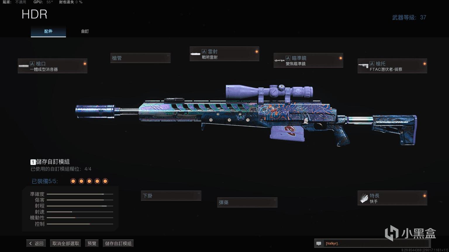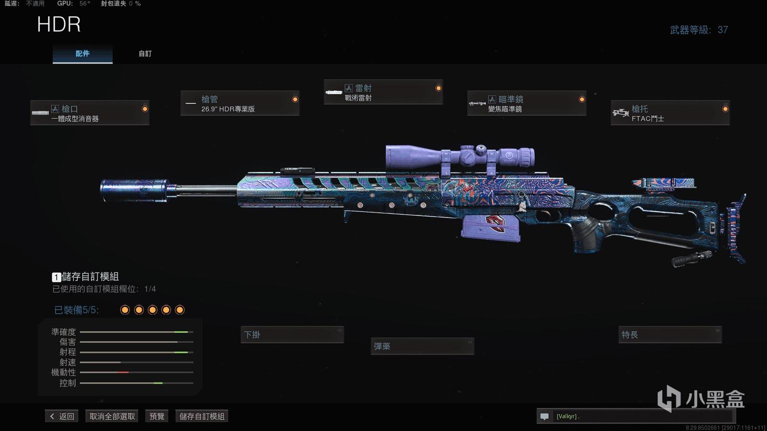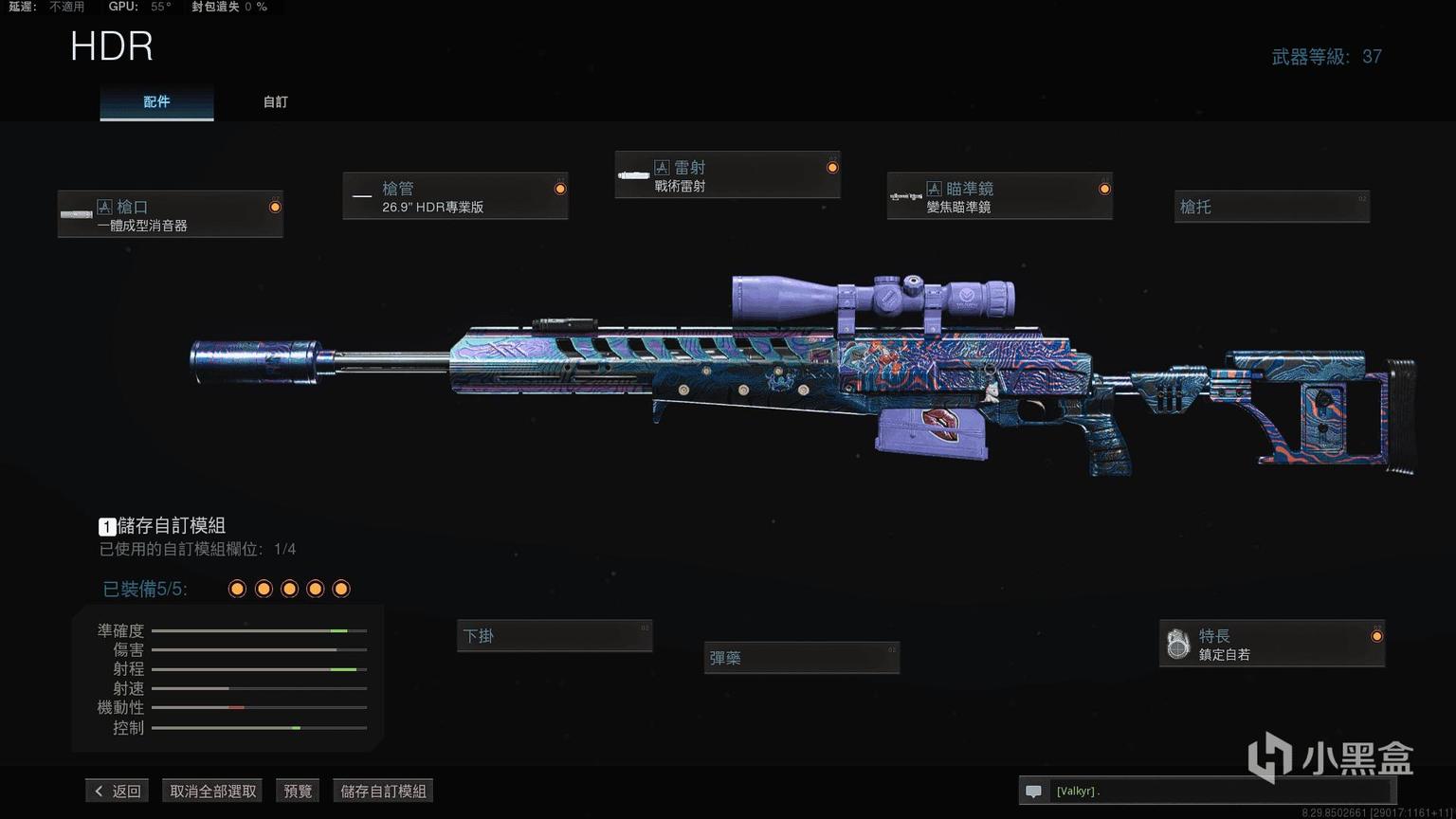 第一套是很常规的HDR配置,打远26.9专家枪管必备,满改射程,海底摄影变焦镜改善视野,枪托镭射满改稳定性。开镜时间667ms,弹速1422.3m/s,开镜移速仅0.77m/s。