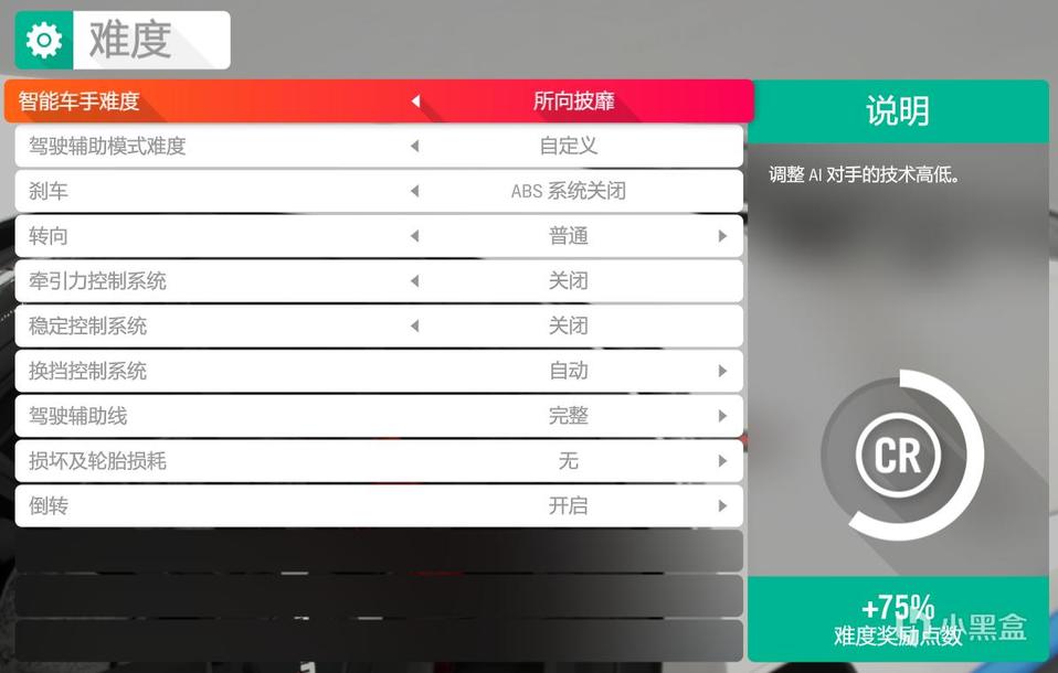 第一行就是ai难度顾名思义,第二行不用管它,着重看一下第三行刹车,也就是ABS,这里我是推荐关闭的,为什么呢?因为在地平线4里,虽然ABS能够帮助你刹车,但ABS实际上不能防止车轮抱死,同时也不能保持车辆的转向能力,过弯的难度也大大增加,因此我是建议把ABS关闭。第四行转向,我们为了提高容错率调整到一般即可。牵引力控制系统和稳定控制系统建议关闭,因为牵引力控制系统会干扰发动机的输出;稳定控制系统则会干扰我们刹车。换挡的话开得了手动就手动,不行就老老实实选自动,手动能够提高成绩,因为自动的话换挡会过慢影响功率输出。剩下的按照自己的喜好调节就好。