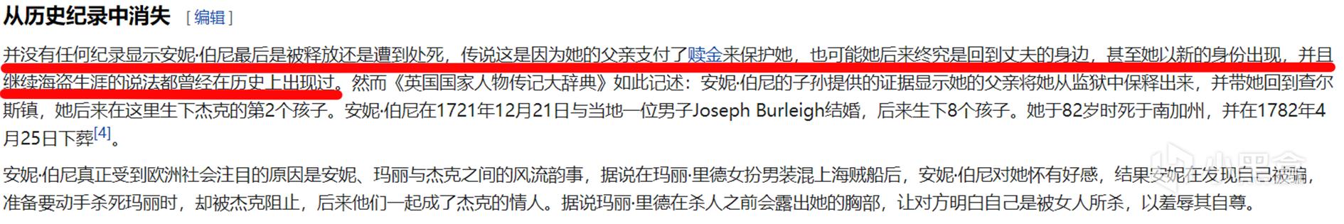 通过后续的文件显示,玛丽·里德在狱中怀孕发烧而死。游戏剧情在收尾部分刺客组织前去营救玛丽·里德和安妮·伯尼,便把这部分历史穿插其中。而对于安妮·伯尼,由于后世对她入狱后的说法不一,育碧便把她设定成为寒鸦号的军需官倒也算合理。