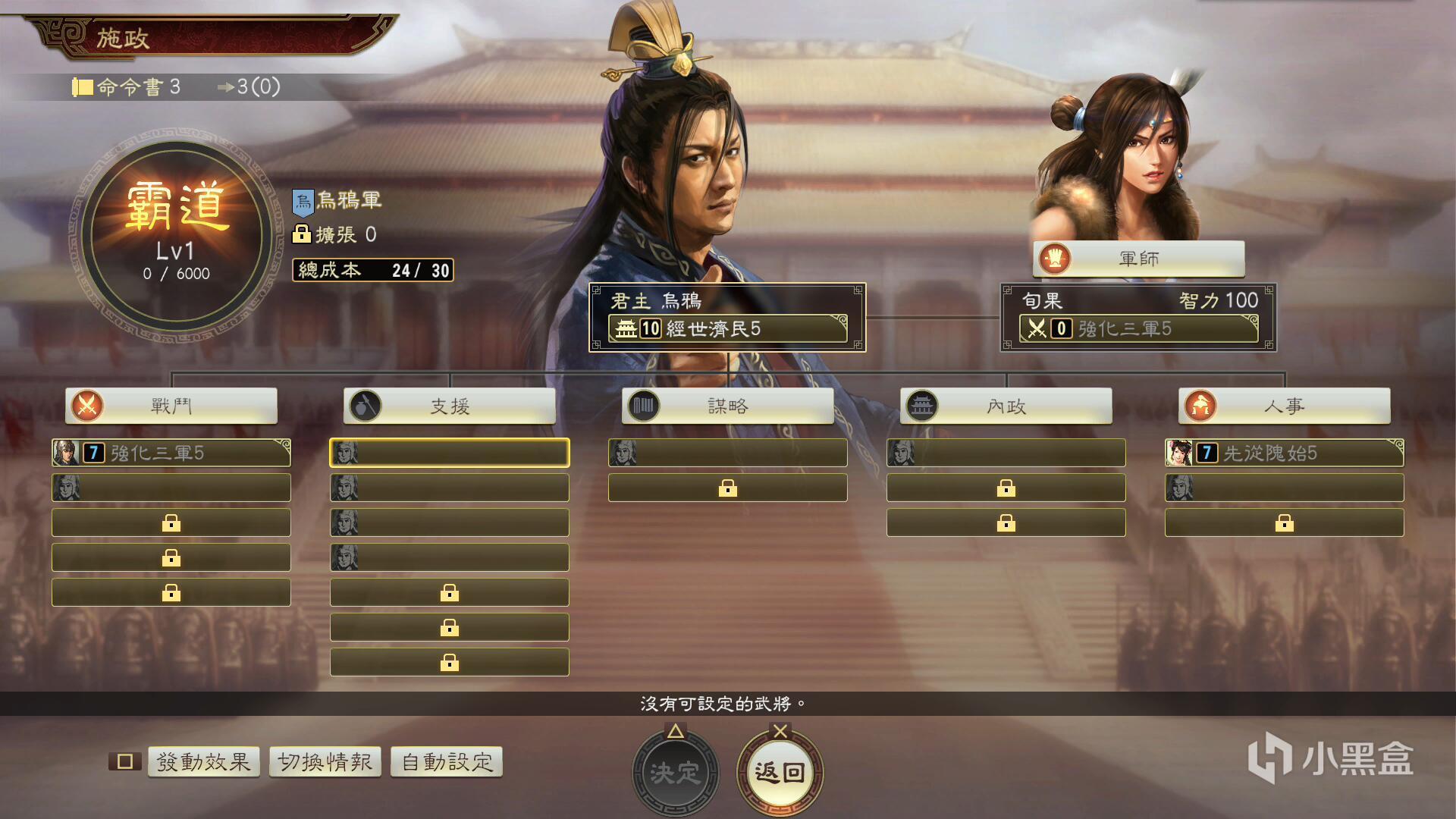 另一方面,本作的内政系统还包括施政武将的选择,在游戏中的施政界面中在不同的分支槽中选择不同的武将,将会带来不同的效果,玩家可根据所处游戏阶段的不同选择适合自己的武将:例如在开荒养兵阶段可以适当选择增加粮草与金钱的增益,而作战阶段则可以优先选择那些带有兵员数量增幅的武将。
