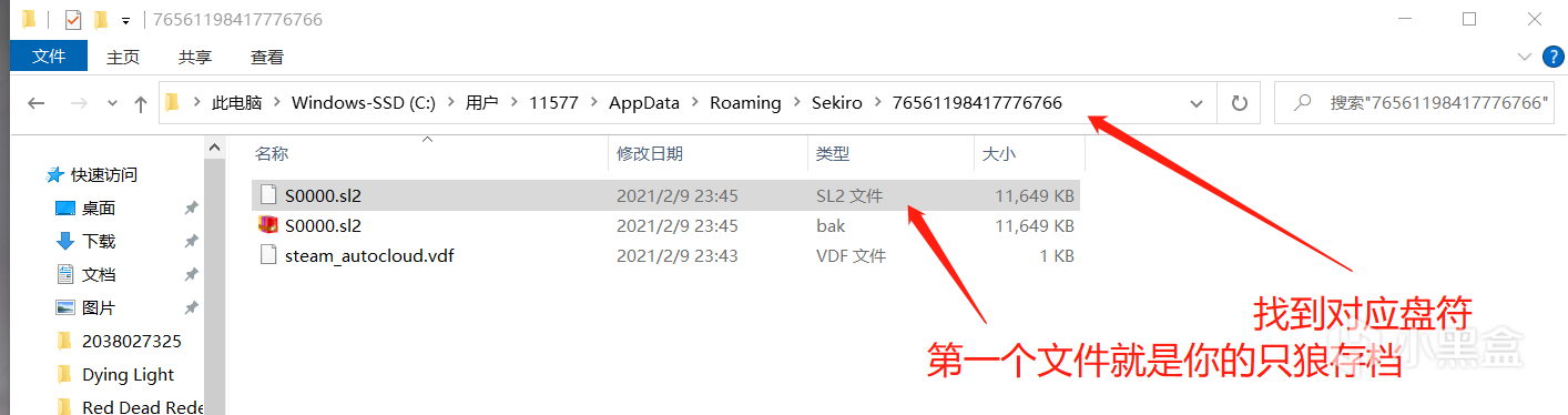 首先要知道你的只狼存档的位置在哪,只狼的存档盘符为:C:\Users\11577\AppData\Roaming\Sekiro\76561198417776766