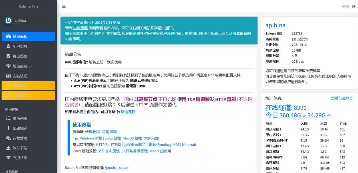 登录完成后,在个人信息页面选择Sakura Frp,进入管理页面。