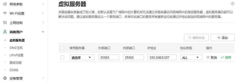 如果使路由器通过虚拟服务器方式连接,需要在路由器设置页面中的虚拟服务器设置中选择新建,地址为开服端地址,内部端口号为25565(视服务器设定),外部端口号需要控制在1~65534,协议类型为全部,完成后保存。