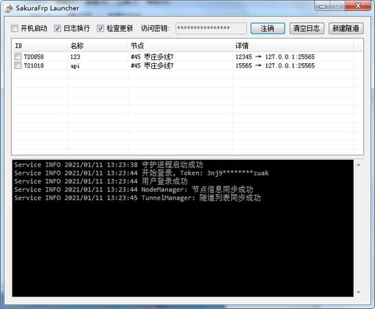 在电脑上打开樱花穿透程序,使用刚记下的访问密钥登录,完成后,即可看到创建的线路。