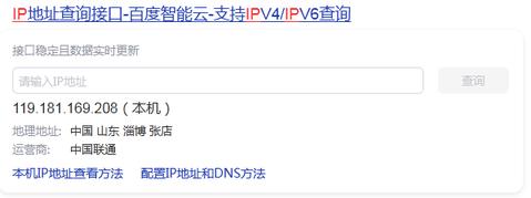 打开百度,搜索IP,第一条结果就是你当前的IP地址,需要将其记下来(如果运营商提供的上网方式为手动指定IP地址则可跳过此步)。