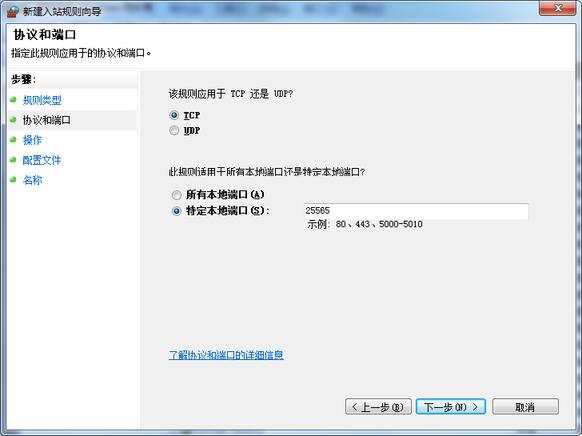 在所有控制面板项中选择Windows防火墙,选择高级设置,在新窗口的左窗格选择入站规则,在右侧窗格下操作中选择新建规则,规则类型选择为端口,特定本地端口为25565(视服务器设置文件而定),应用规则为TCP,完成后再次重复同样的步骤,此次应用规则为UDP。