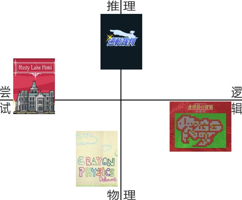 同时,物理和推理似乎也是对立的,物理解谜里面没有什么描述,你推理三分钟不如我点一下有用,总之干就完了。而推理解谜中则少见用物理去暴力解决问题(不是指剧情上的)(弹丸论破:我外挂一个节奏系统!)推理解谜和物理解谜在观察——逻辑这一轴上虽然有偏向但不绝对,所以我们用第二条轴,把推理——物理挂上。