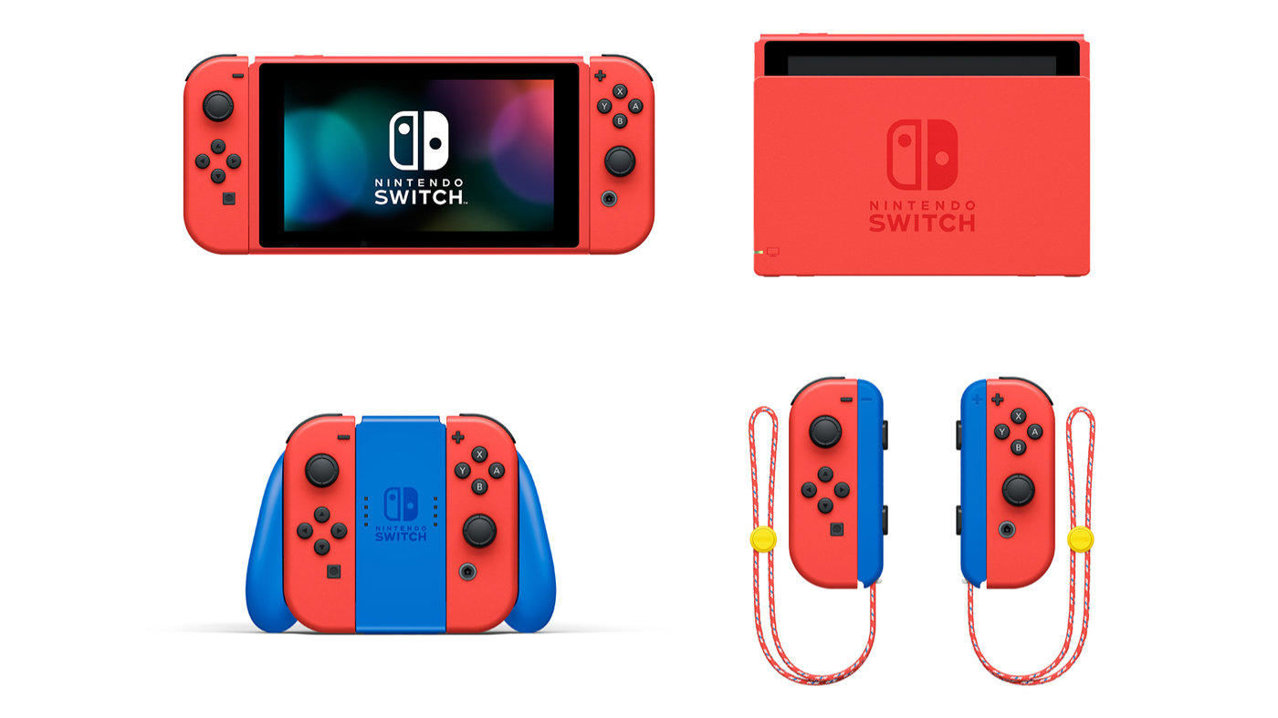 这两款主机都以马力欧的主题色红和蓝进行设计,套装中的组件也都相同,其中以马力欧主机进行重新设计的部分为基座、主机、joy-con、握把、腕带,并且购买限定套装还将附送一个马力欧限定款便携包。
