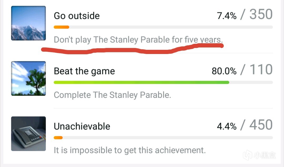 《史丹利的寓言》是一款由独立团队制作的第一人称冒险游戏,于2013年10月17日发售。这款游戏通关只需短短30分钟,但却有几十种不同的分支和结局,再加上出众的氛围塑造和背景设定,让无数玩家沉迷其中。不过也有一些玩家发售当天通关一遍后就再也没打开过,奇葩的是,这些五年没玩过游戏的玩家竟然可以在今天(2018年10月17日)解锁一项成就。这项成就名为“出去走走”(Go outside),达成条件正好是“5年不玩《史丹利的寓言》”。也就是说如果当初买来就吃灰,今天你将成为全世界第一批获得这项成就的玩家!
