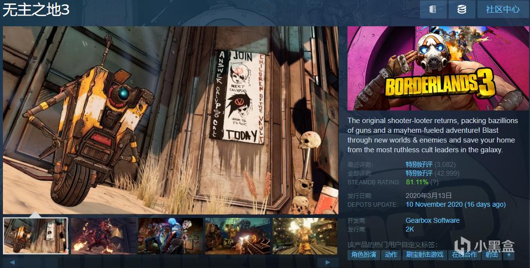 这也是一款优点缺点非常明显的作品,10年前无主之地刚出的时候惊艳了许多FPS的玩家,剧情和重复度也是经常被吐槽的点,但如果玩过前作或者对无主之地背后的世界有过了解,剧情有些地方还是非常煽情的,当然了这款游戏在游戏性上是非常棒的,里面人物说话都非常欢乐无厘头,比如小吵闹,目前是新史低,也是非常不错的游戏。
