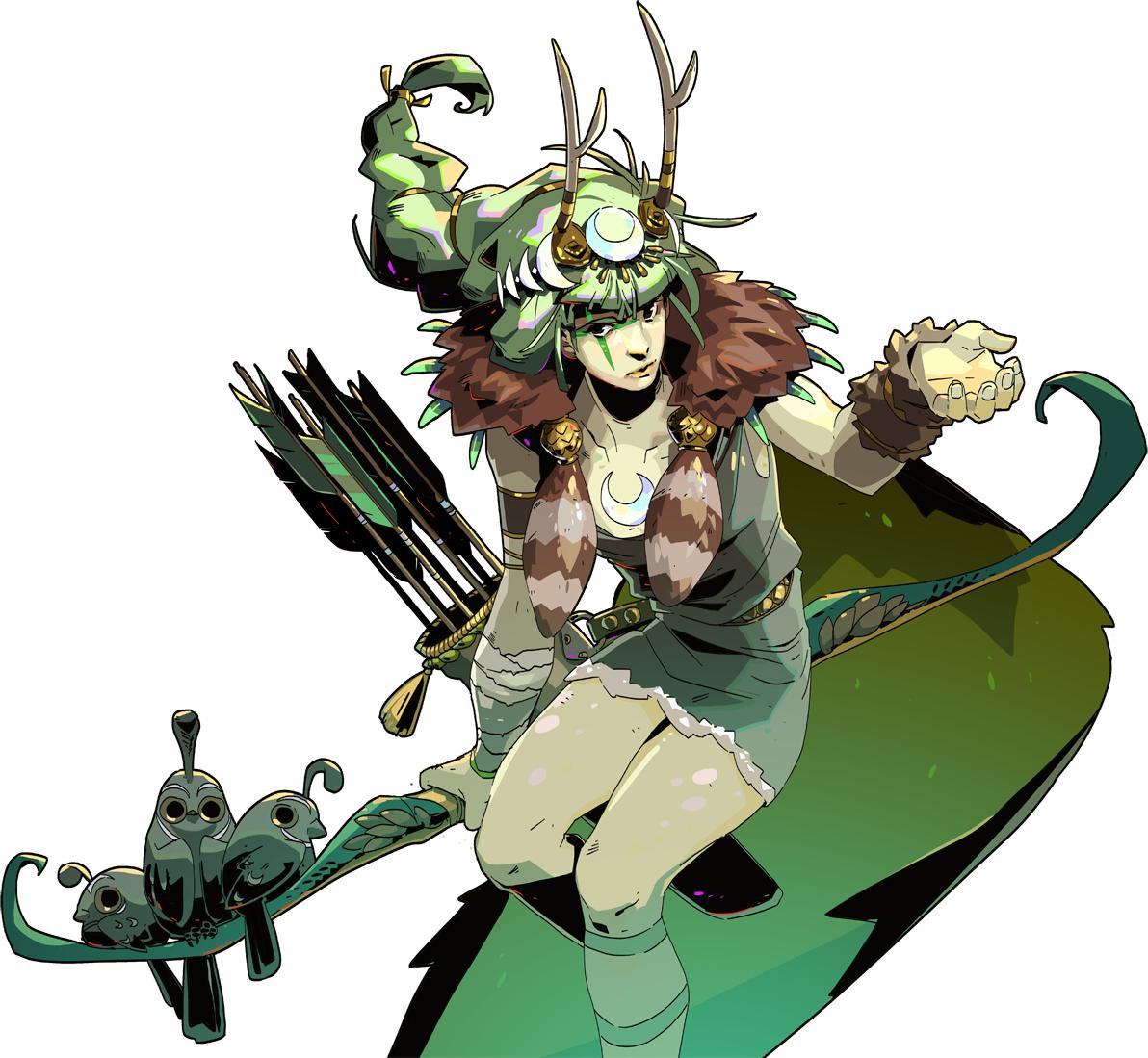 游戏中的阿尔忒弥斯持弓背箭,弓箭是她的常见象征,她的弓上停着三只鸟,应为鵟鹰,头上所戴为鹿角。