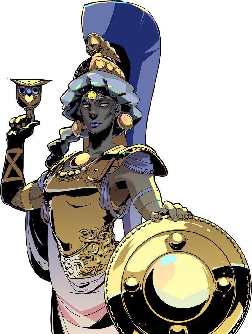 在游戏中,雅典娜的形象为一举鸟持盾,身披甲胄的黑皮肤女子,鸟是猫头鹰,盾是神盾埃癸斯,盔甲应为其出生时母亲打造,甲上有一人脸,应是蛇发女妖美杜莎。但黑皮肤的形象并不是源自希腊神话,至于它出自哪里,这里给出一种可能(仅仅只是可能)的推测(并不排除是错误的推测),该形象来自于英国学者马丁·贝尔纳(Martin·Bernal)所著的《黑色雅典娜—古典文明的亚非之根》( Black Athena: The Afroasiatic Roots of Classical Civilization)一书,该书认为希腊古典文明来自东方,尤其是埃及。