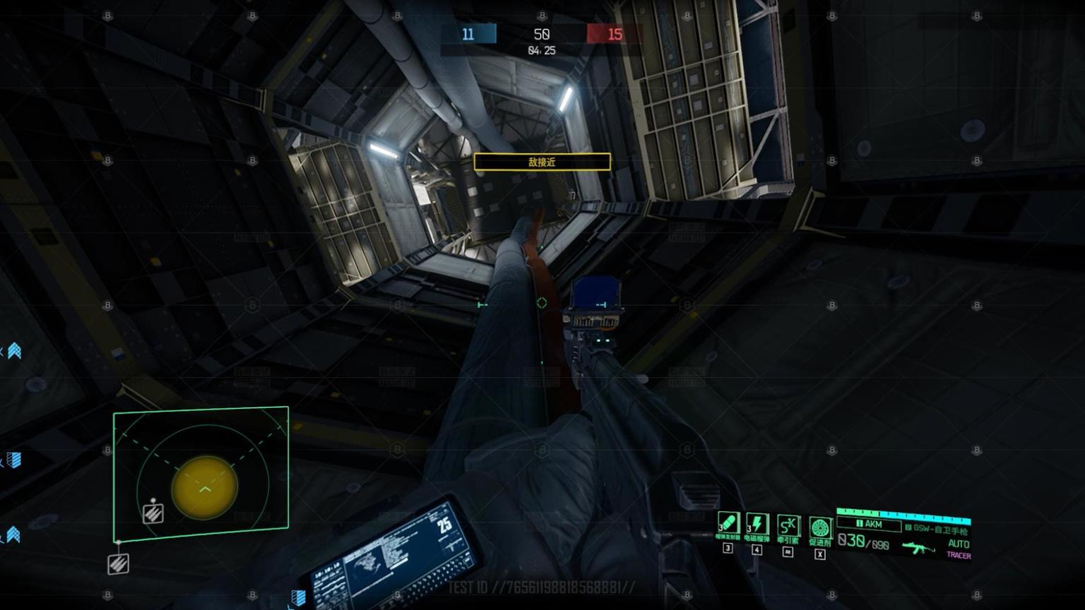 另一方面,游戏的音效也进行了相应的处理。虽然游戏中的科幻设定让玩家在一定程度上能够接收敌人开枪的声音,但是玩家自己开枪的声音和角色呼吸的杂音交叠起来,对局过程中很难察觉敌人开枪发出的微妙声响。再加上游戏中太空漂浮的失重设定,玩家也彻底失去了通过脚步声判断敌人位置这一索敌利器。
