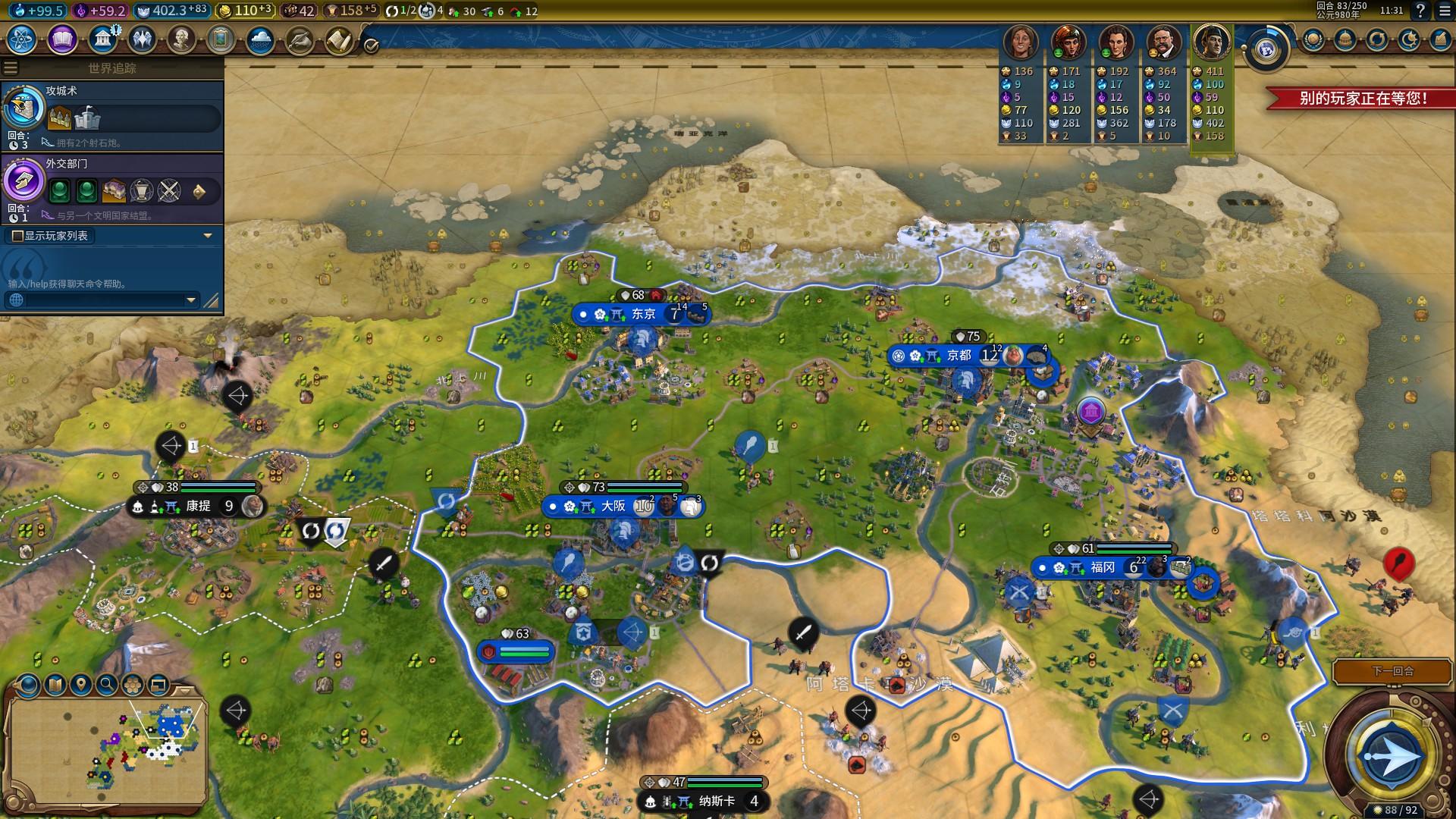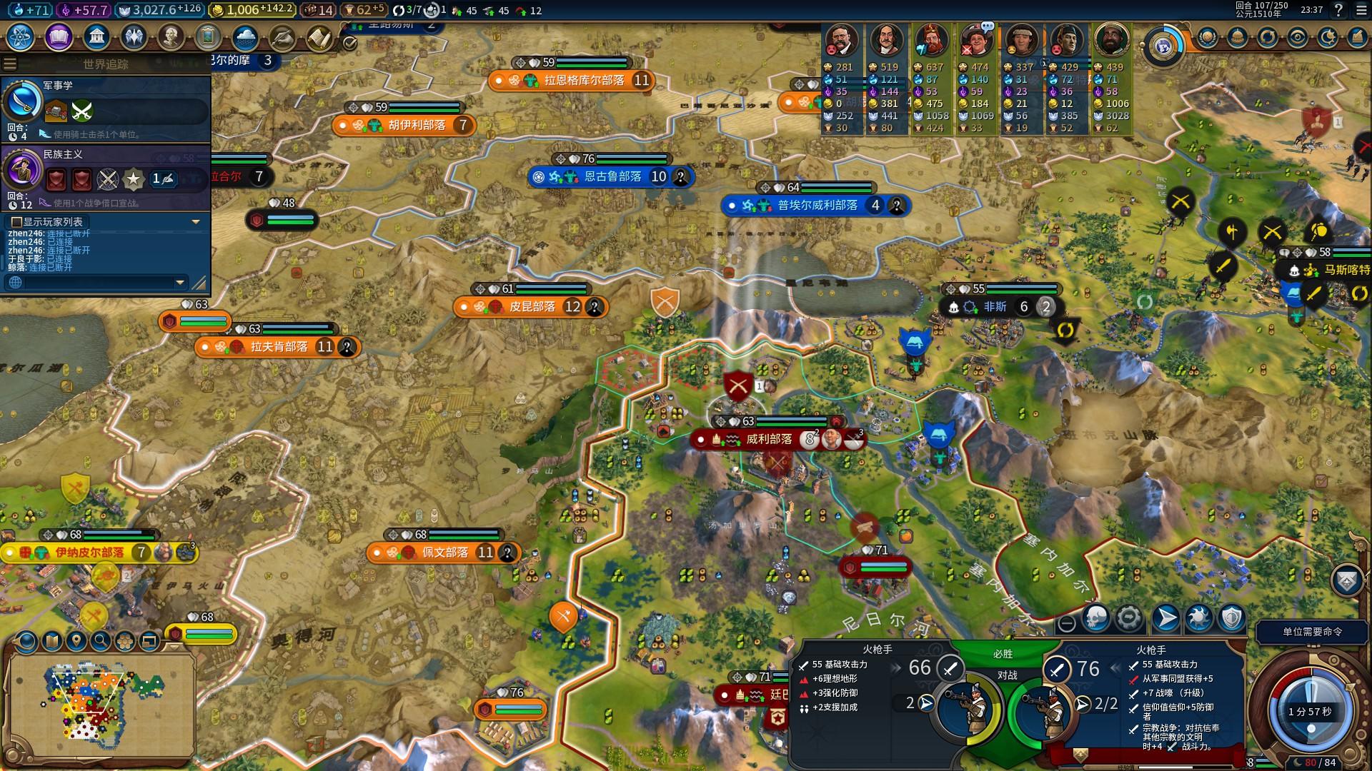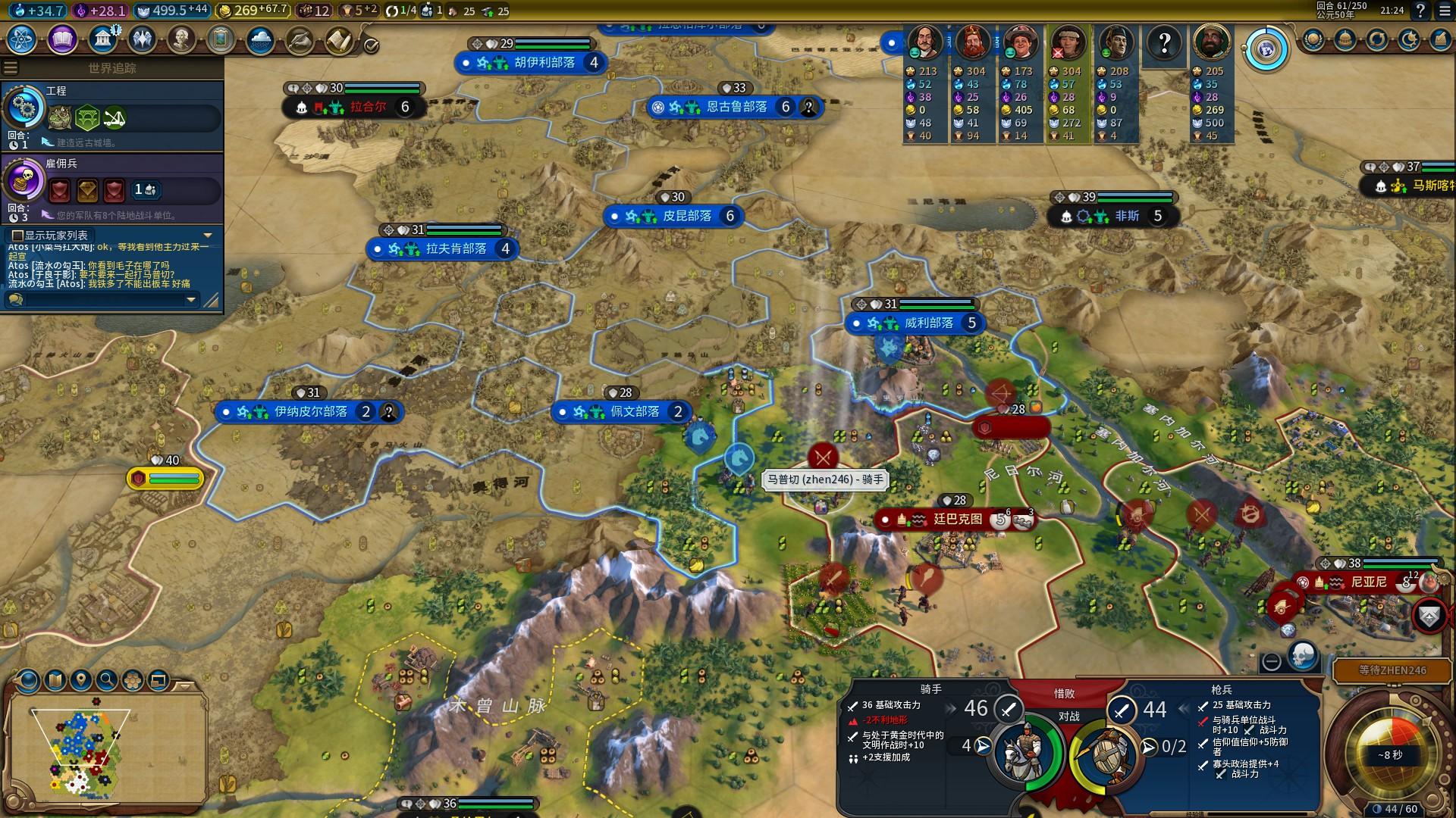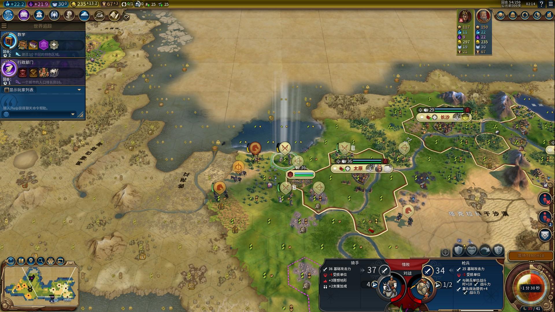 如上面所指的市政树“军事传统”,挂上增加骑兵生产力的政策卡,砍树也好,手锤也罢,在联机速度中,我们通常会在35T之前这个节点打出第一波进攻!一波进攻往往需要至少6匹的小马,以及混编一些勇士与弓箭手,在打下第一个城市后还可以升级剑客继续向敌人施压。