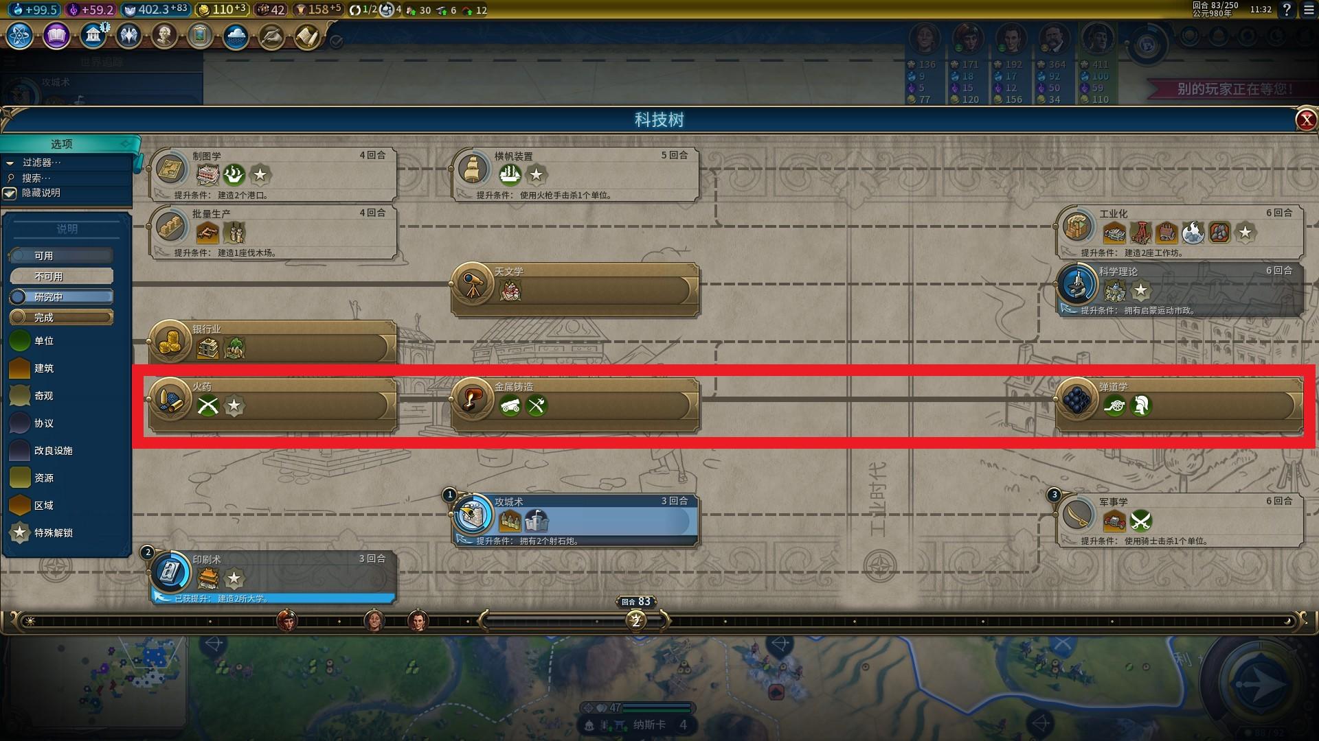 胸甲一波对于科文的要求都比较高。火药——金属制造——弹道学都要跑出,胸甲骑兵是坦克之前最强大的重骑单位,能保持很长时间的优势。同样,它也可以用重型战车直接升级得来,配合大将军的加成,80T的这一记重拳能让你在战场上所向睥睨!不过需要玩家对于节奏的把控以及整体水平的要求都要更高,不推荐在PVE中使用。