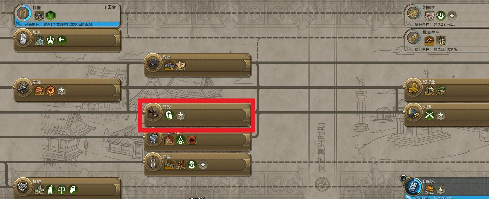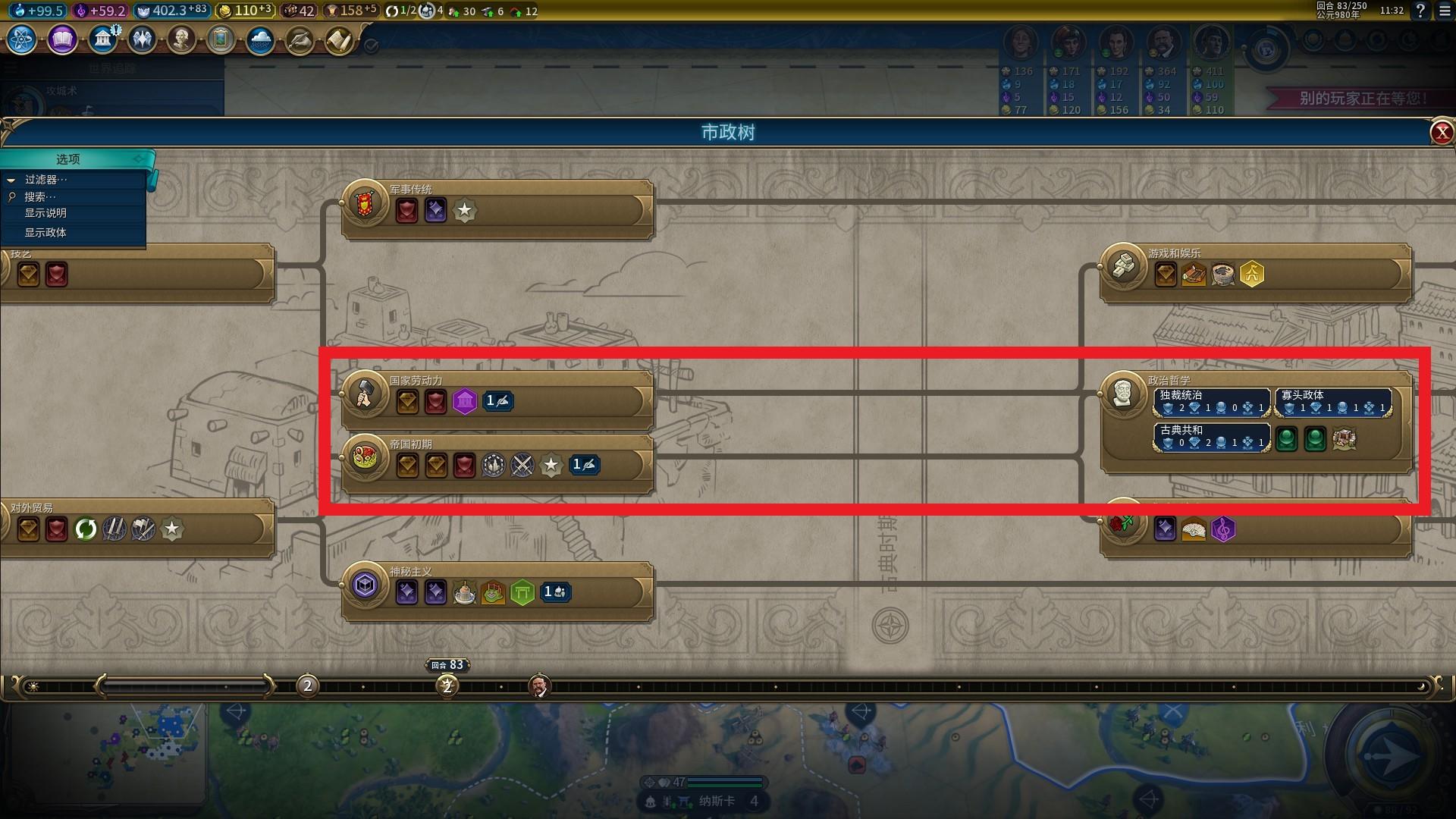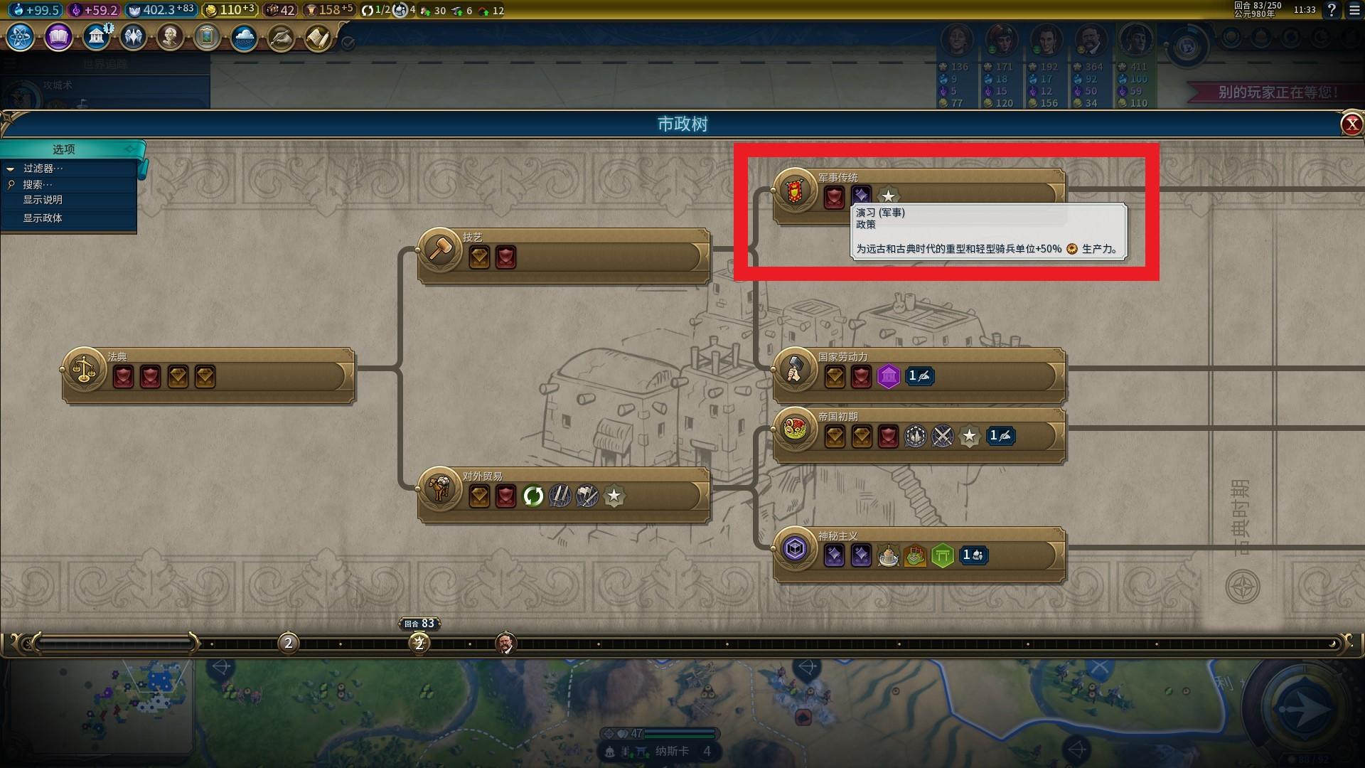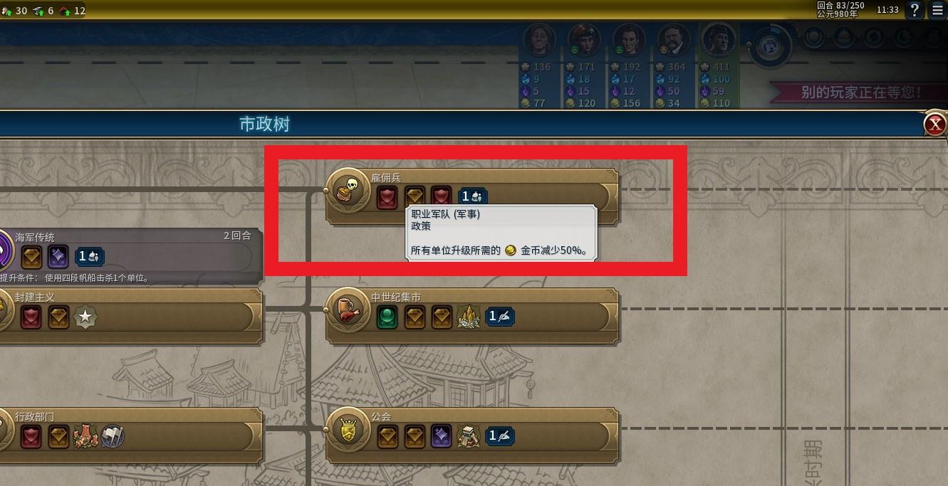 马镫一波对于科技的需求则更低,我们通常会提前爆出一批远古时代的单位重型战车,直接升级成骑士,那么市政树中的“雇佣兵“则显得尤为重要。