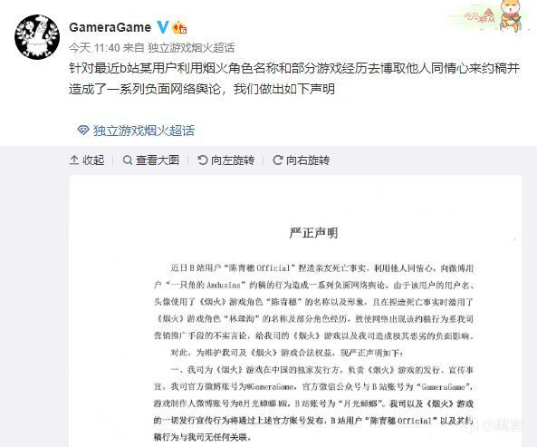前段时间,国产恐怖游戏《烟火》在Steam平台上线。其剧情内容丰富刺激也因此收获了不少好评,引起国内玩家的广泛关注。而最近,其官方GameraGame在微博上发出声明称,B站某用户利用游戏中角色名称和部分游戏经历博取他人同情心和进行约稿,在网络上造成了一系列负面舆论。最后,《烟火》官方委托了律师对相关情况进行取证调查,该事件才算告一段落。