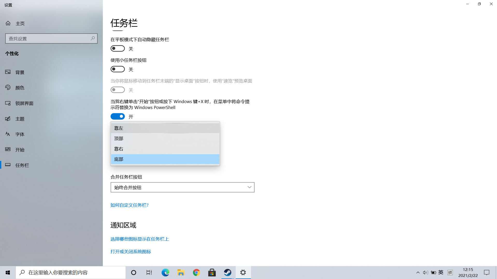 - 找到任务栏在屏幕上的位置,修改底部为靠左