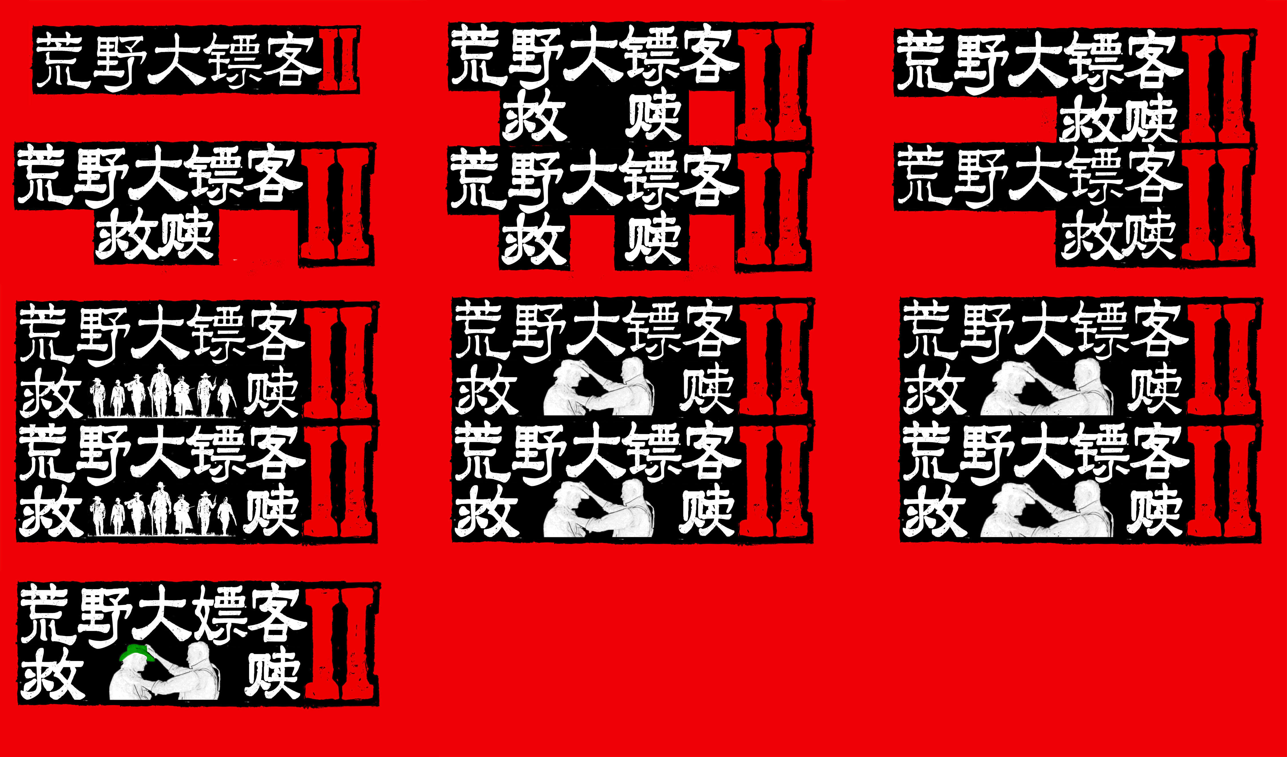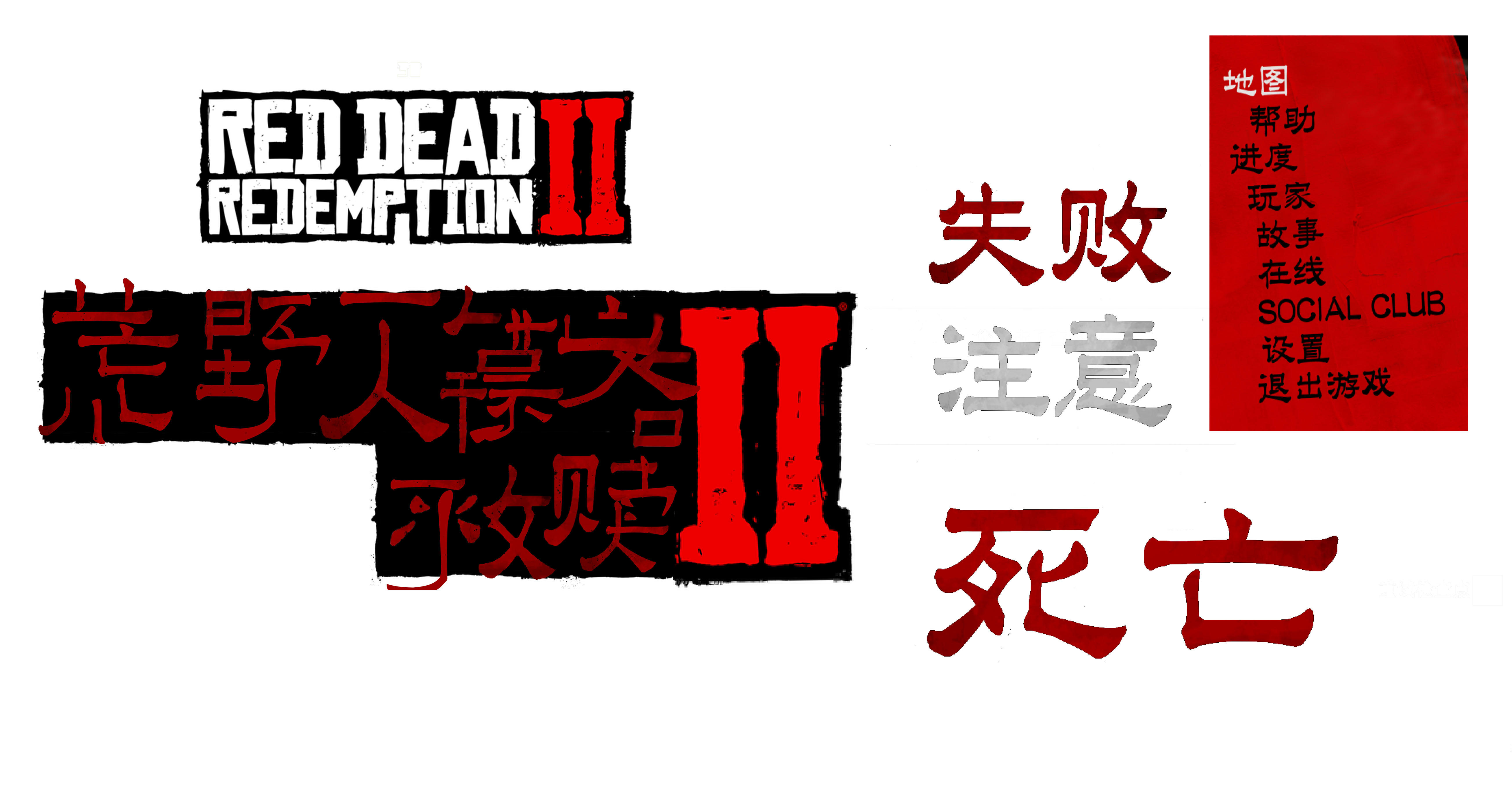 游戏里在自动存档、任务失败和死亡的时候分别会出现”注意“、”失败“、”死亡“的字样(好像还有警告,但我没找到),于是我开游戏截图顺便在游戏里逛了一下关游戏一气呵成,截下来这几个字和菜单(但因为菜单字太小了只能做参考)。然后我把这几个字全部肢解再合成成了”荒野大镖客救赎“几个字。