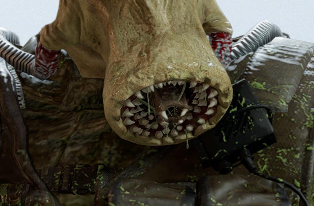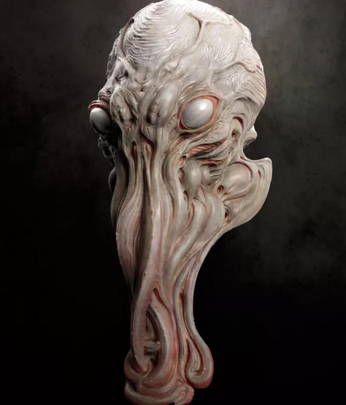 克苏鲁风格的设计,乍看给人一种恶心的感觉,精心设计的嘴部喷头细节,能看到48颗牙齿优雅的分布在口腔里。这款头饰,在实战中出镜率是常见的。