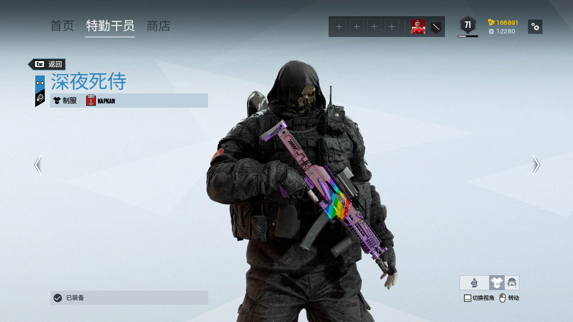 这款黑色戴帽子的服装,在诡雷这个干员身上属于顶级水平之一。带有龟裂纹理的骷髅头,双眼在暗处发射亮光。适合在韩国地图的昏暗展览厅地面埋伏着。
