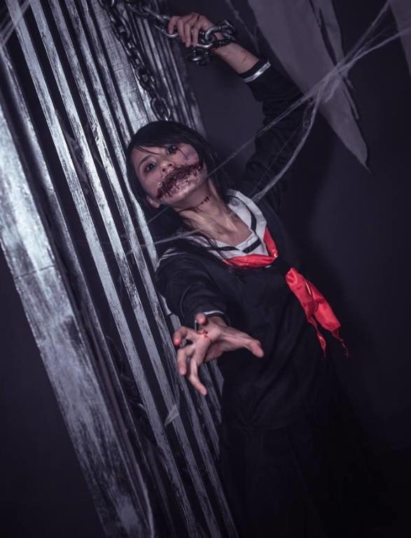 头上长有触角,双眼瞳孔泛白,血盆大口开裂,露出大牙和沾血牙龈。这款裂口形象,最早源自于一部日本的恐怖电影。在西方的万圣节化妆活动中,也有不少女子喜欢这个装束。