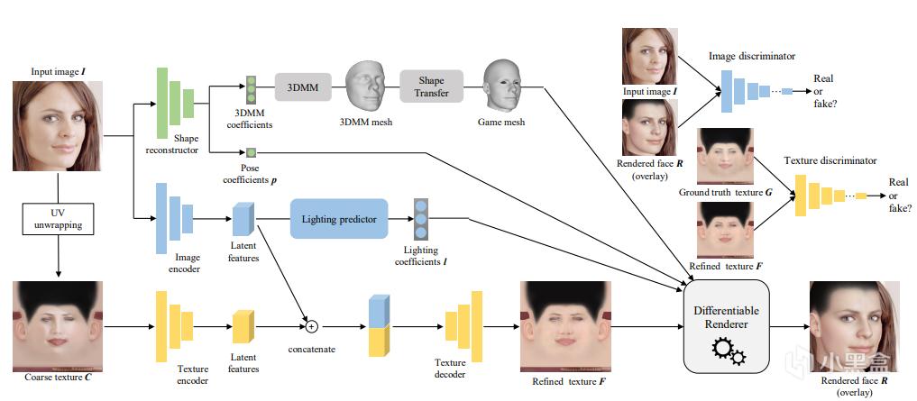 神经网络以人脸图片和未处理过的UV粗纹理贴图的“空间坐标映射”为输入,预测光照系数和细化后的纹理图,由于许多游戏的渲染引擎无法直接使用这些渲染后的人脸图,所以将这些渲染输出后的人脸图的梯度,通过反向传播训练到每个需要更新的人脸参数模块,从而达到“端到端”的训练方式。