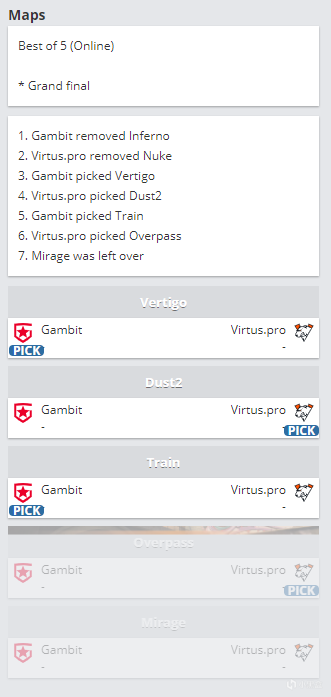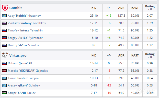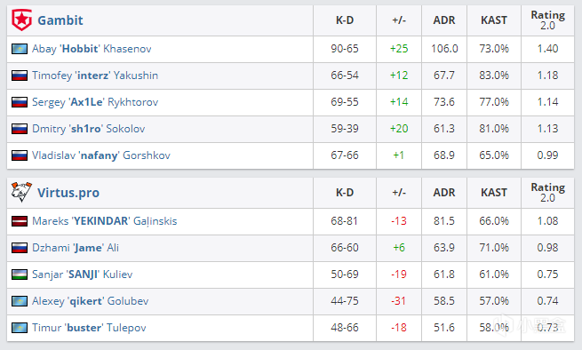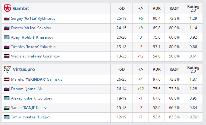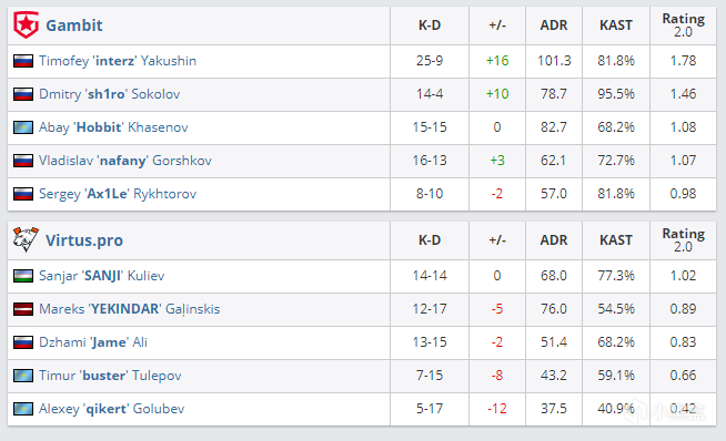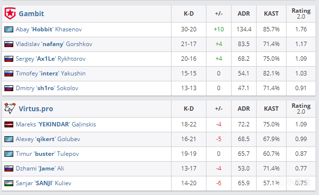 次回合nafany终于在a斜坡找回场子单杀YEKINDAR,Hobbit的及时补枪也是帮助Gambit取得人数优势,后续VP虽然放下雷包,但回防时良好的补枪循环帮助Gambit再拿一分。VP选择不放赛点,a斜坡被VP成功占领,qikert的耐心等到了猎物,首杀出现后Gambit调整站位的时候被VP抓住机会,VP终于阻止了Gambit的拿分势头,12-14。连续拿分Gambit却没经济,eco五人前压换回两把ak,3v3的残局Gambit选择了保枪,VP再追一分。第二十八回合,VP提速a斜坡,YEKINDAR完成突破,buster双杀击溃Gambit防线,14-14。只保下一把枪Gambit只能eco,a斜坡的火拼中VP成功拿到赛点。常规时间最后一个回合,YEKINDAR和nafany的对位成了整局的缩影,nafany再被单杀,VP一波进入a区,2v4的残局VP稳健拿下,16-14,VP大比分1-0领先。