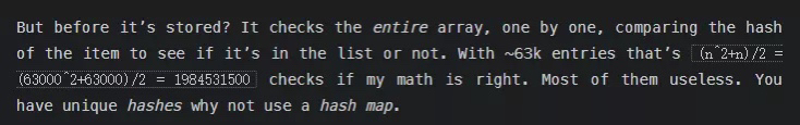 T0ST发现,游戏代码导入文档与物品的效率奇低无比。首先,代码每次解析JSON文档中的一项物品后,都会重新计算文档中的字符数量,这就需要63000次计算。