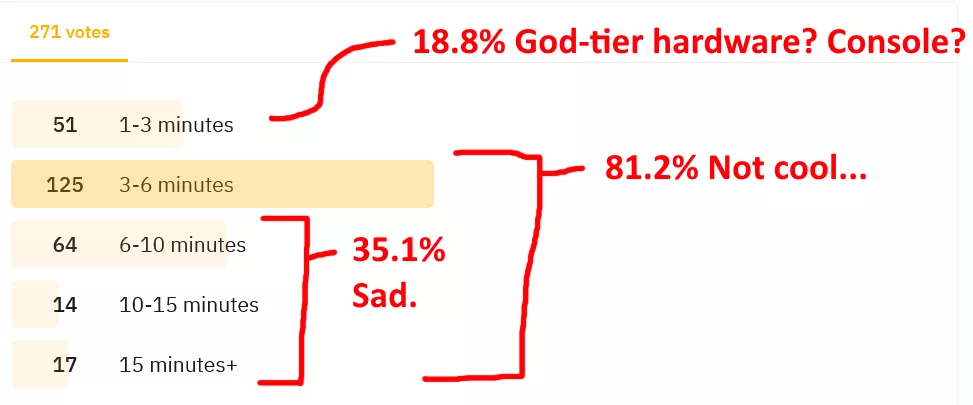 根据Reddit上7个月前发起的某项271人参与的不记名投票,仅有少数坐拥高端配置PC或次世代主机的玩家能够在3分钟内进入GTAOL,享受不到这种体验的玩家则占据了81.2%。