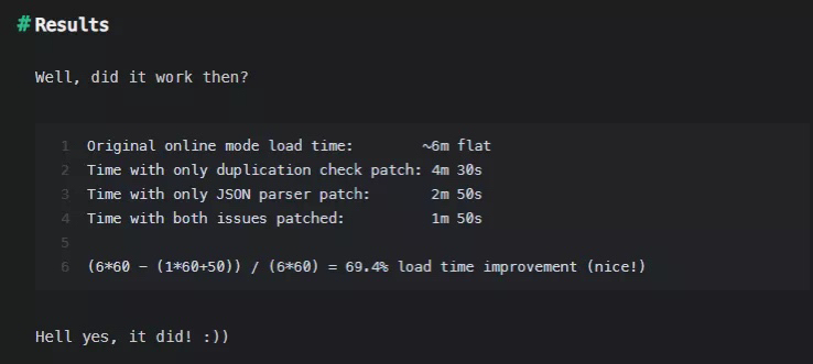 于是T0ST自己编写了两个补丁。针对第一个问题,T0ST创建了一个缓存,当R星的代码尝试计算文档字符数量的时候,会读取缓存里的数据,将计算次数从63000次减少到仅读取缓存的1次。第二个问题就更好解决了,T0ST让代码跳过了检查算法值的步骤,直接省去了上亿次的计算。