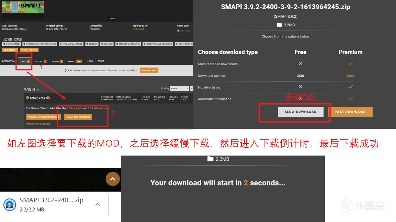 注:压缩包文件全部移动至根目录,同时在安装好SMAPI后会产生一个MOD的文件夹,后续的MOD下载后后解压移动至此MOD文件夹下即可。
