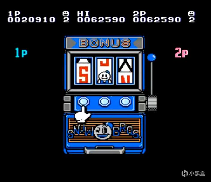 一般游戏的奖命机制都是通过分数实现的,例如每10000分奖励1命,或者每100金币奖励1命,但是《雪人兄弟》中还有更直观、更高效的奖命方式,那就是老虎机小游戏。每当玩家击败Boss后,都会进入一个老虎机模式,玩家需要拉动拉杆开启转盘,再在合适的时机按下停止按钮。