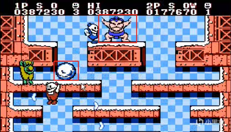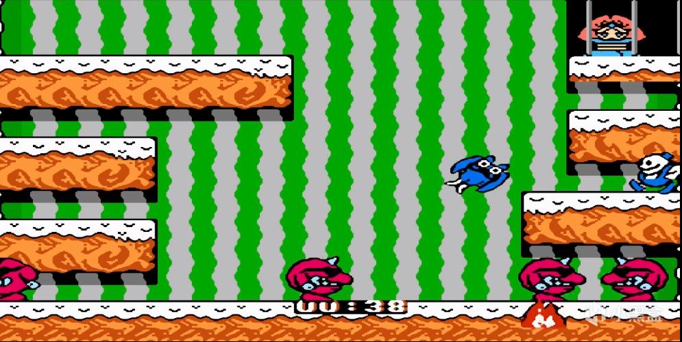 从20关起就加入了“高台”,玩家不能直接跳上去的超高台阶。一般这种台阶上都有一个相扑大汉,他的攻击方式是大范围撒雪球,不仅会对玩家造成威胁,还会拖延战斗时间。这种关卡只要先在高台下方造出一个雪球,然后借着雪球踮脚就可以跳到高台上先发制人,打败后还会有奖励道具。使用雪球踮脚的方法在30关之后的“深坑”中也有非常大的作用,如果踮脚的同时踢出雪球,还能够解决一个敌人,一举两得。