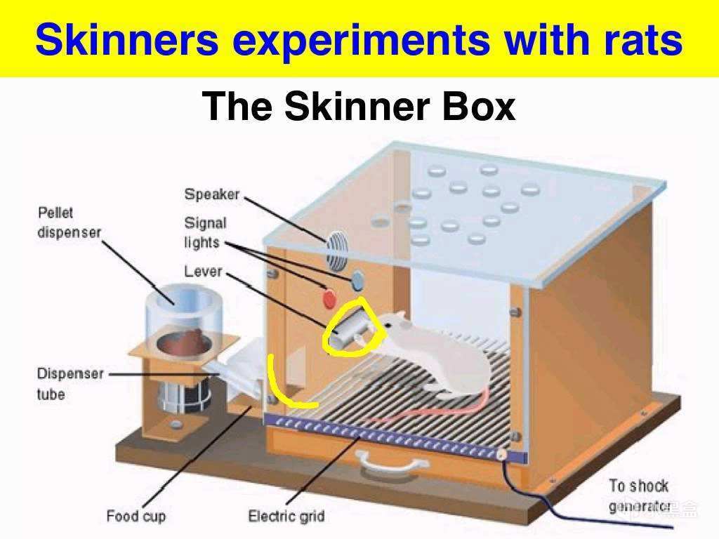 在这个实验中,斯金纳将小老鼠放在一个箱子之中,箱子中设置有一个操纵杆,当老鼠转动操纵杆时便会有食物奖励通过专用的通道掉落下来,老鼠也就得到了相应的奖励。